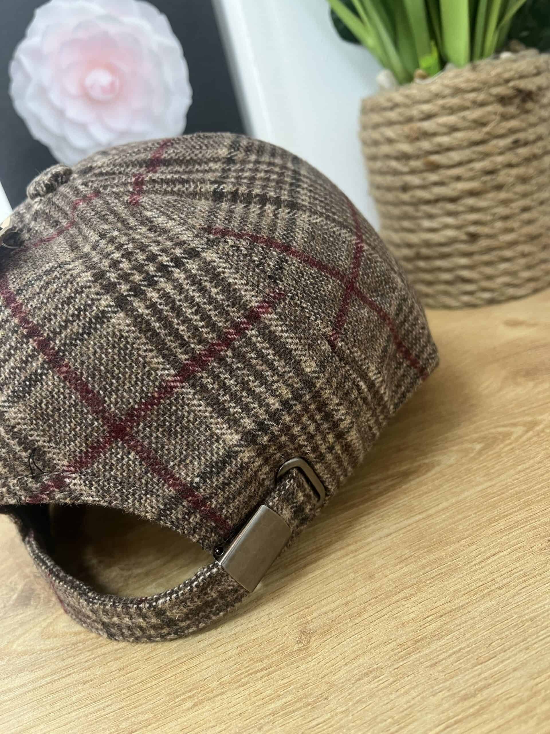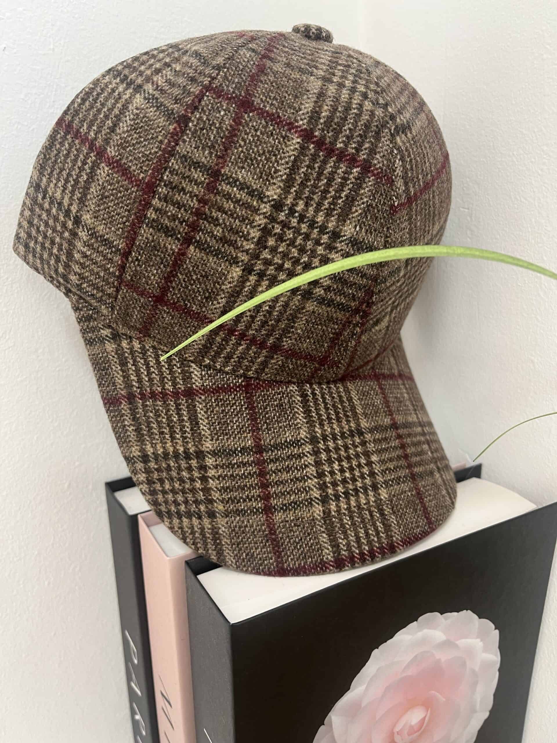 Gorra en paño estampada de cuadros, en colores camel, burdeos y chocolate.