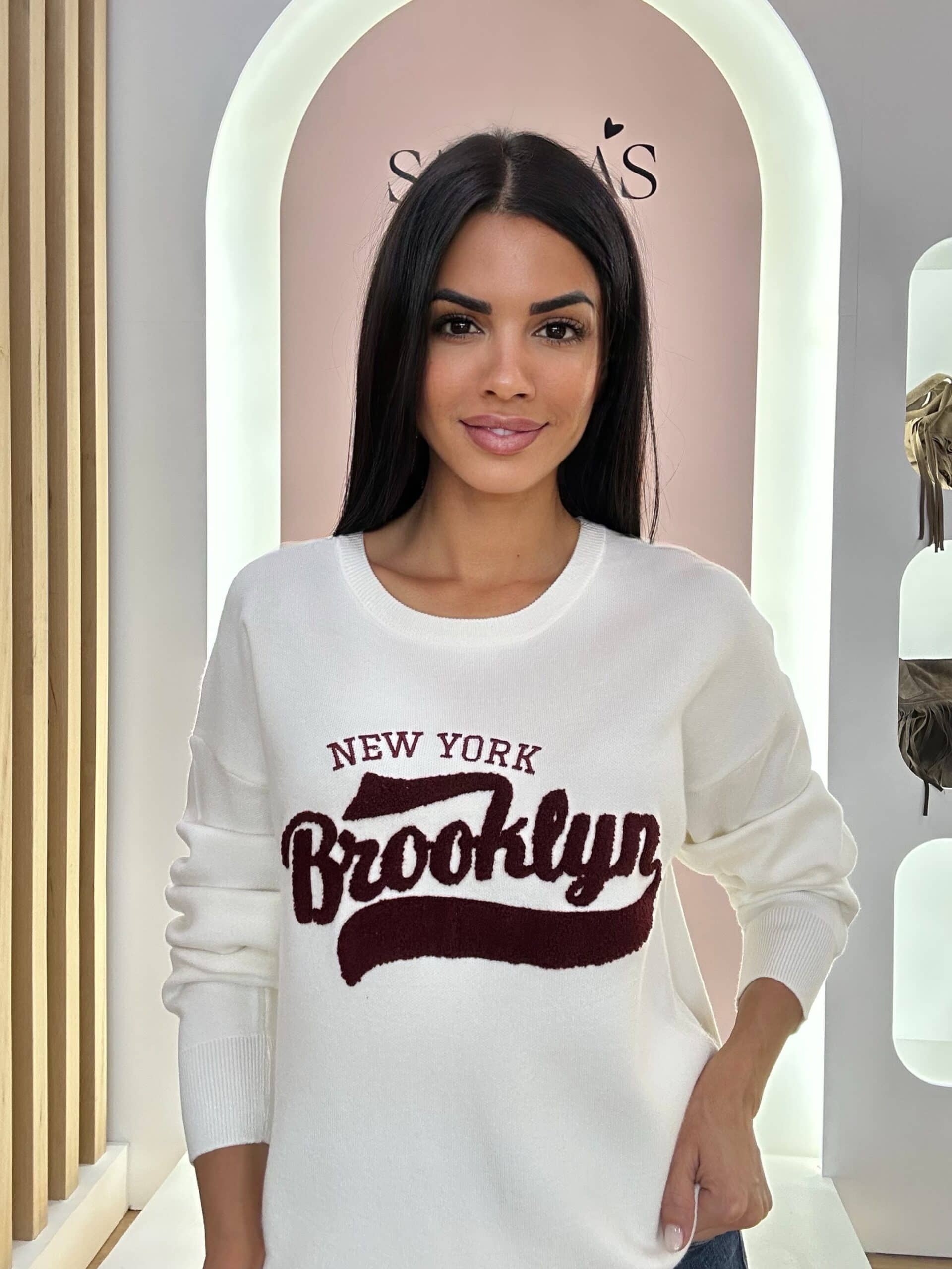 Jersey en punto elástico de color blanco roto, cuello redondo, puños y bajo en canalé, detalle de letras bordadas en burdeos.