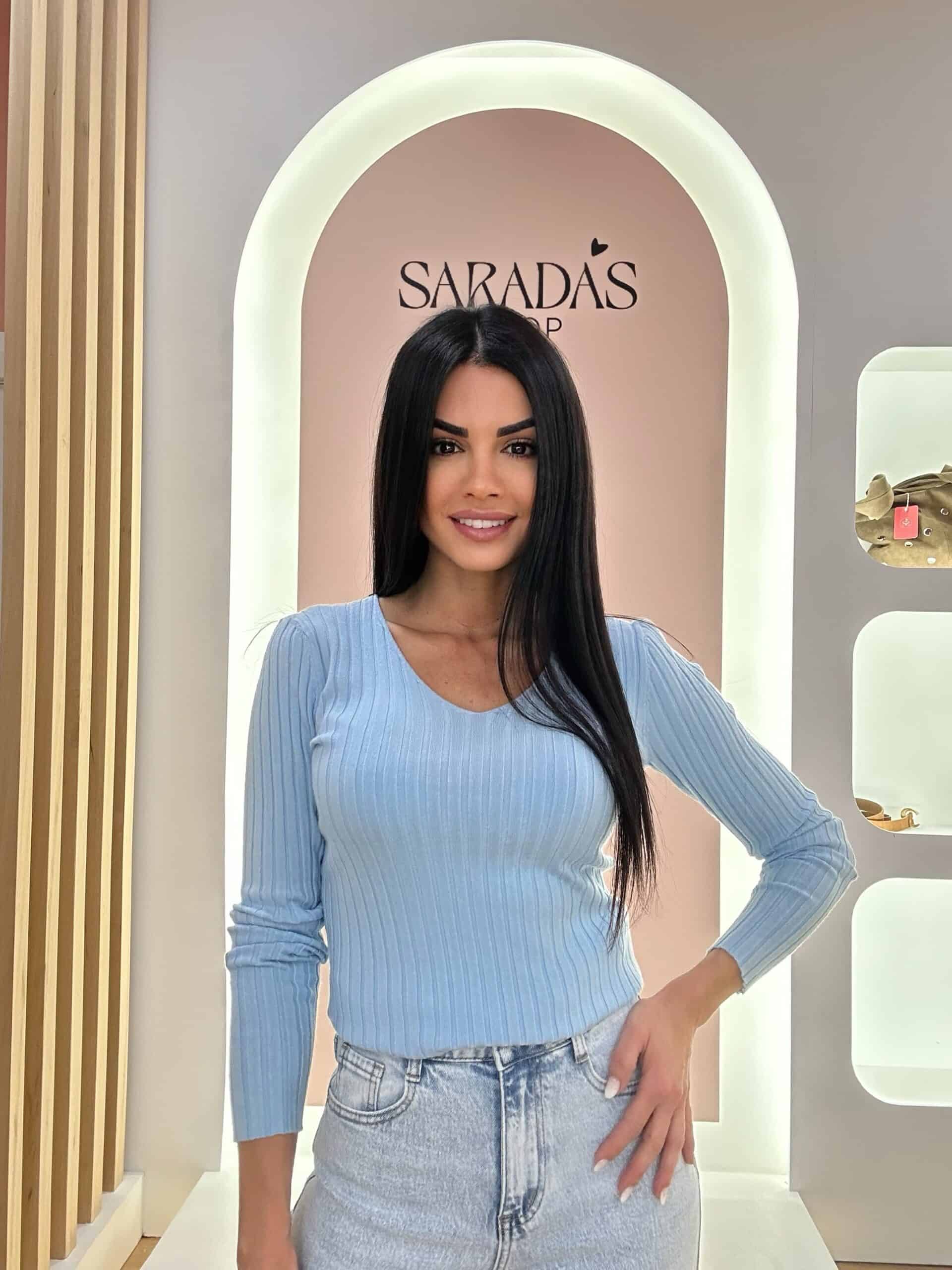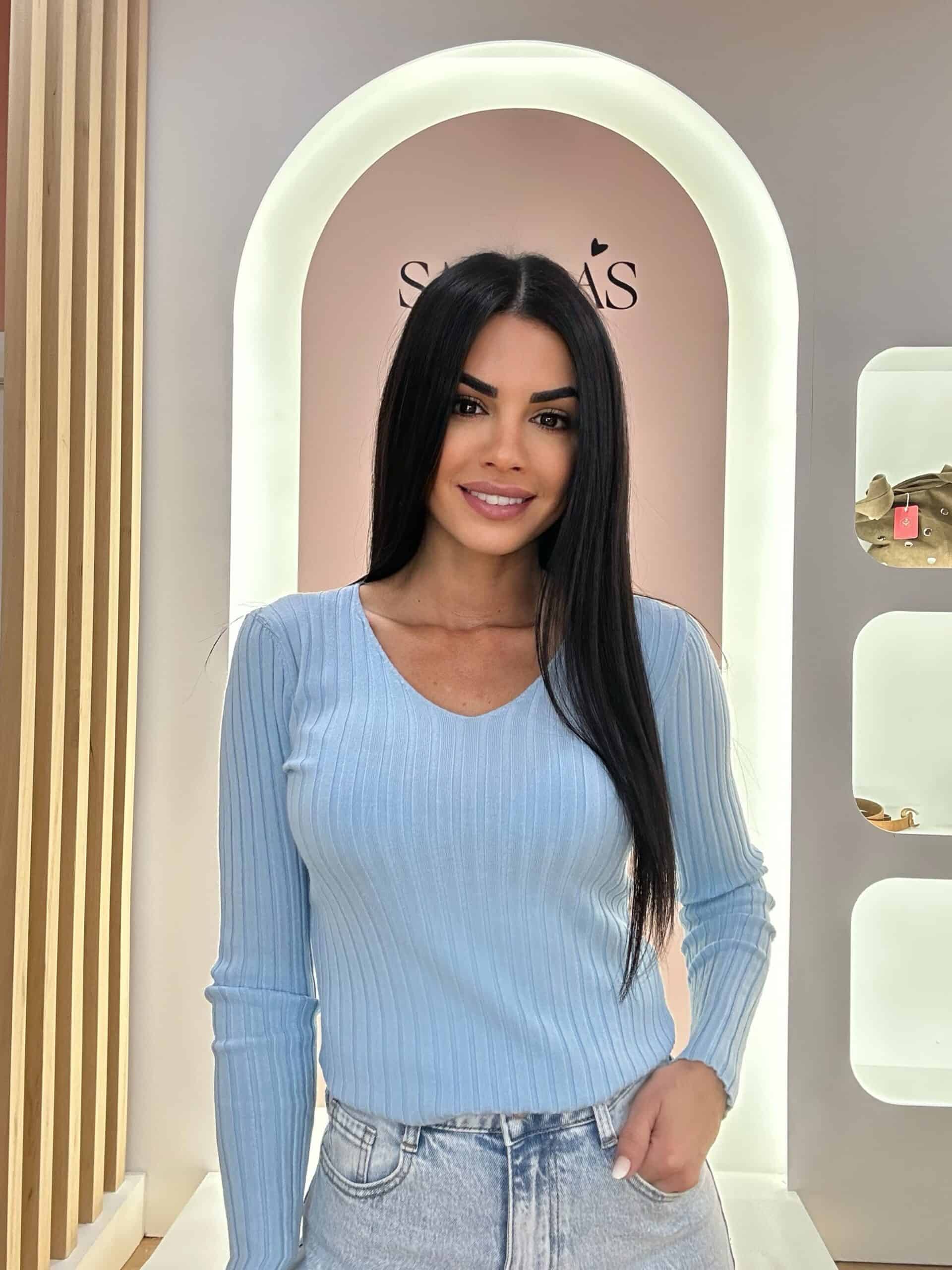 Jersey en punto fino de canalé, de color azul pastel, cuello en pico. Talla única (S/M/L) Medidas que te pueden interesar: Sisa: 39cm. (sin estirar), largo desde la sisa: 40,5cm. 50%Viscosa. 28%Poliéster. 22%Poliamida.