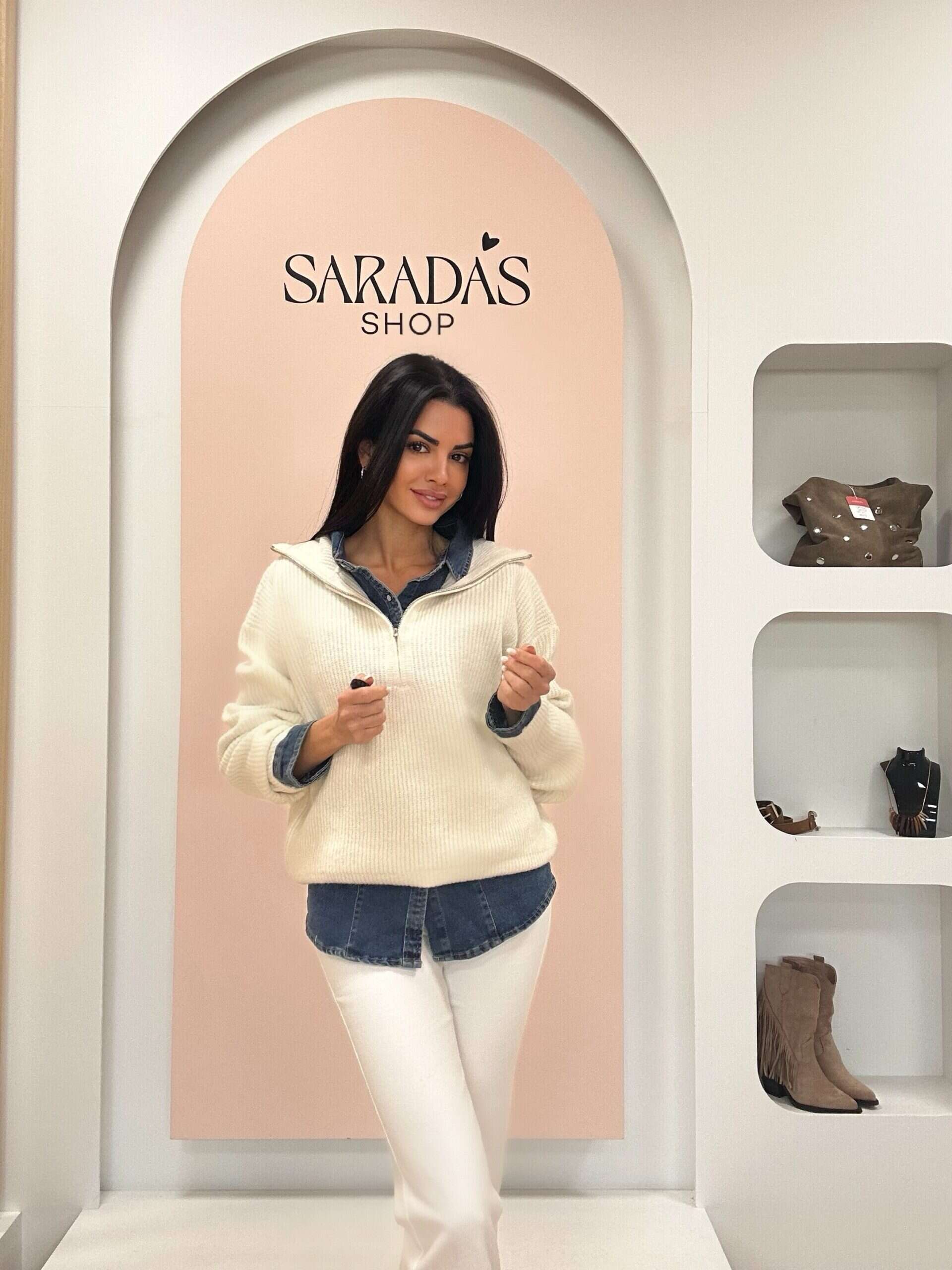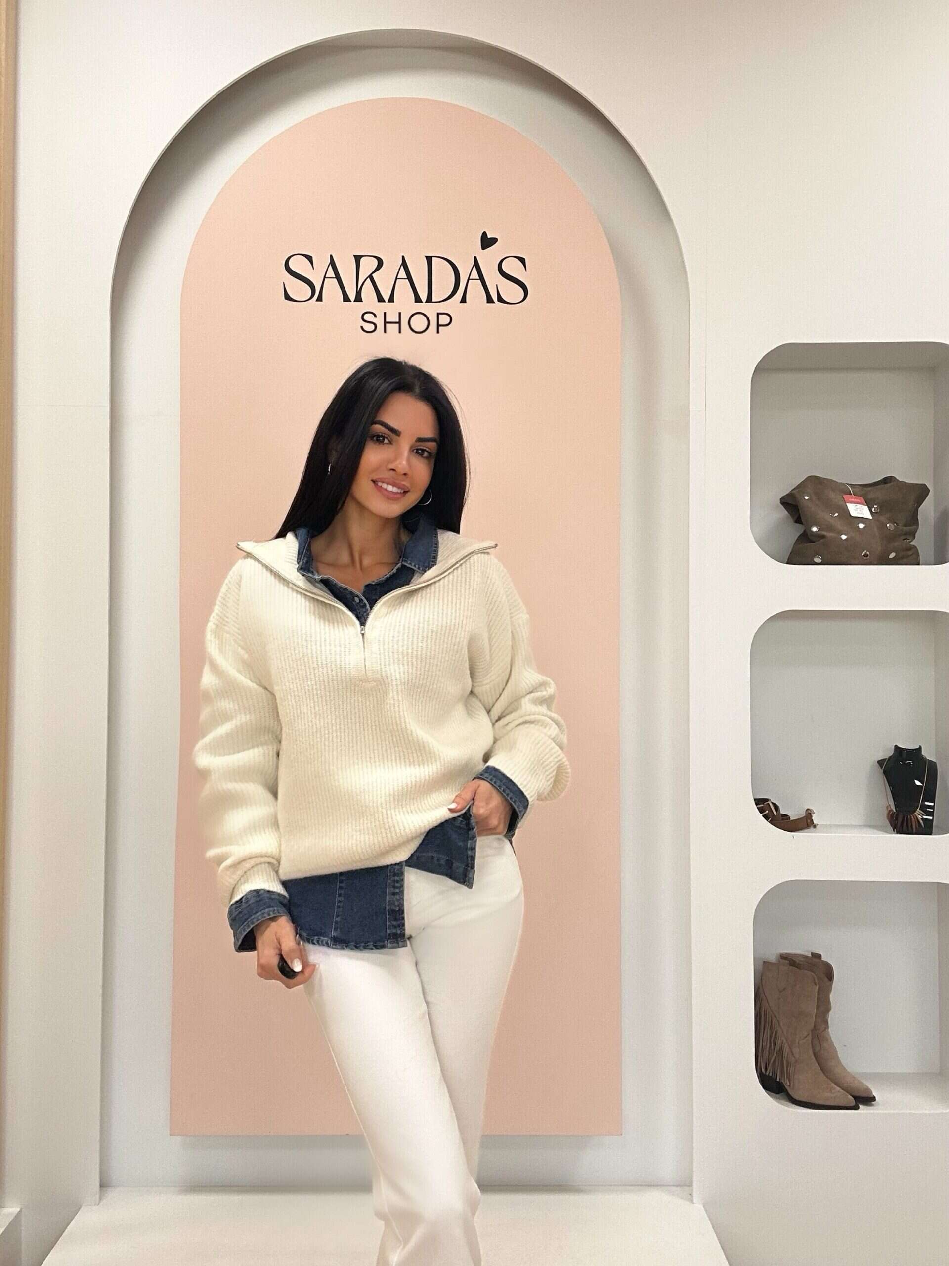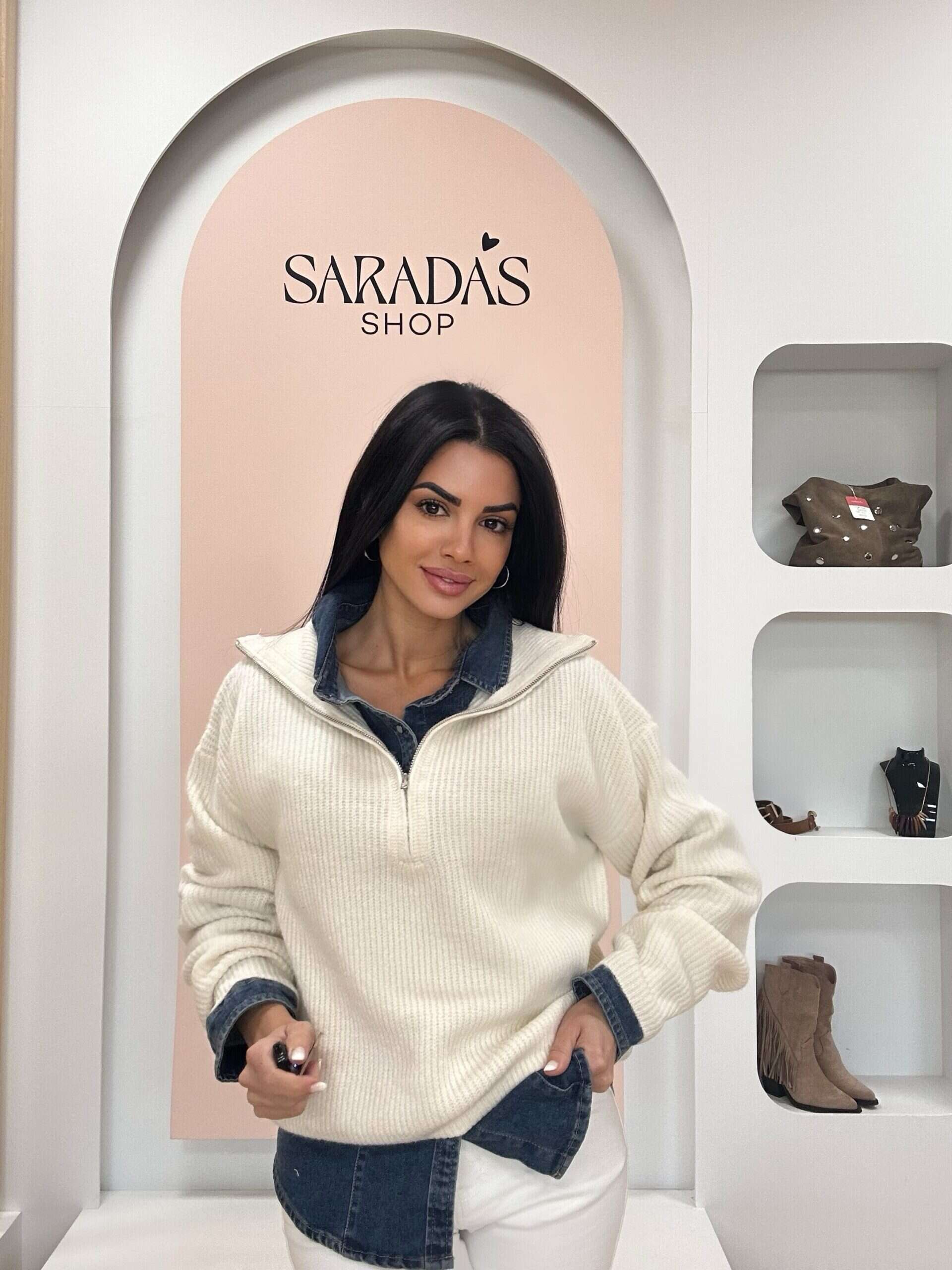 Jersey en punto grueso elástico, de color crema, cuello alto con detalle de cremallera hasta el pecho de color plateado, corte recto. Diseño Italiano.