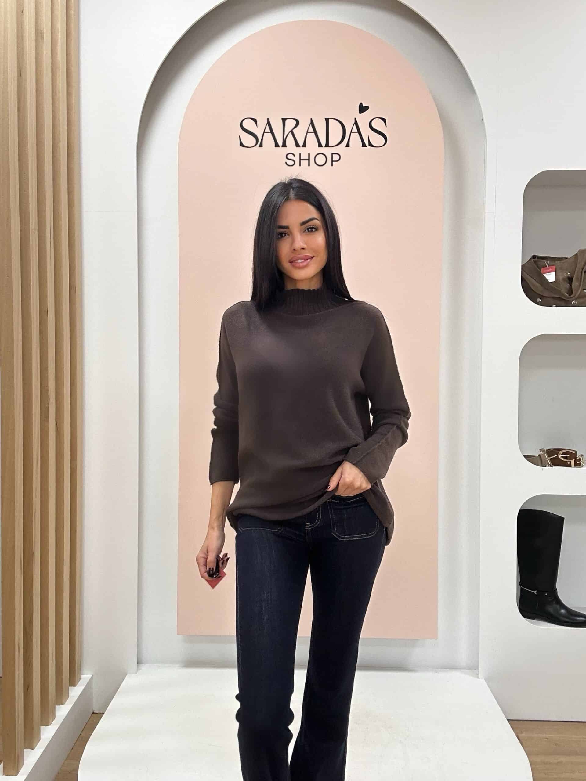 Jersey en punto elástico de color chocolate, pequeño cuello alto en canalé, corte recto, detalle de costura en mangas, bajo redondeado.