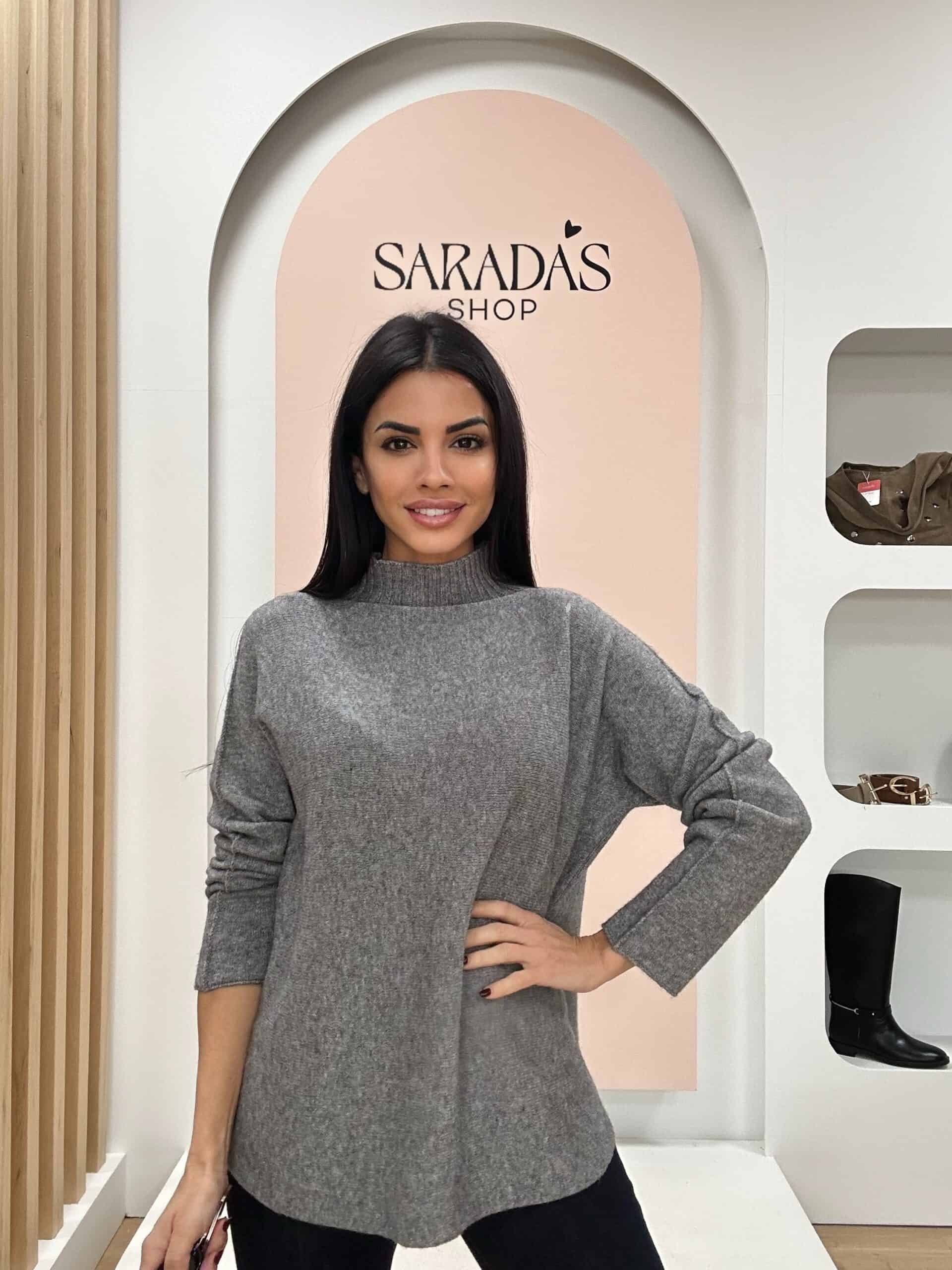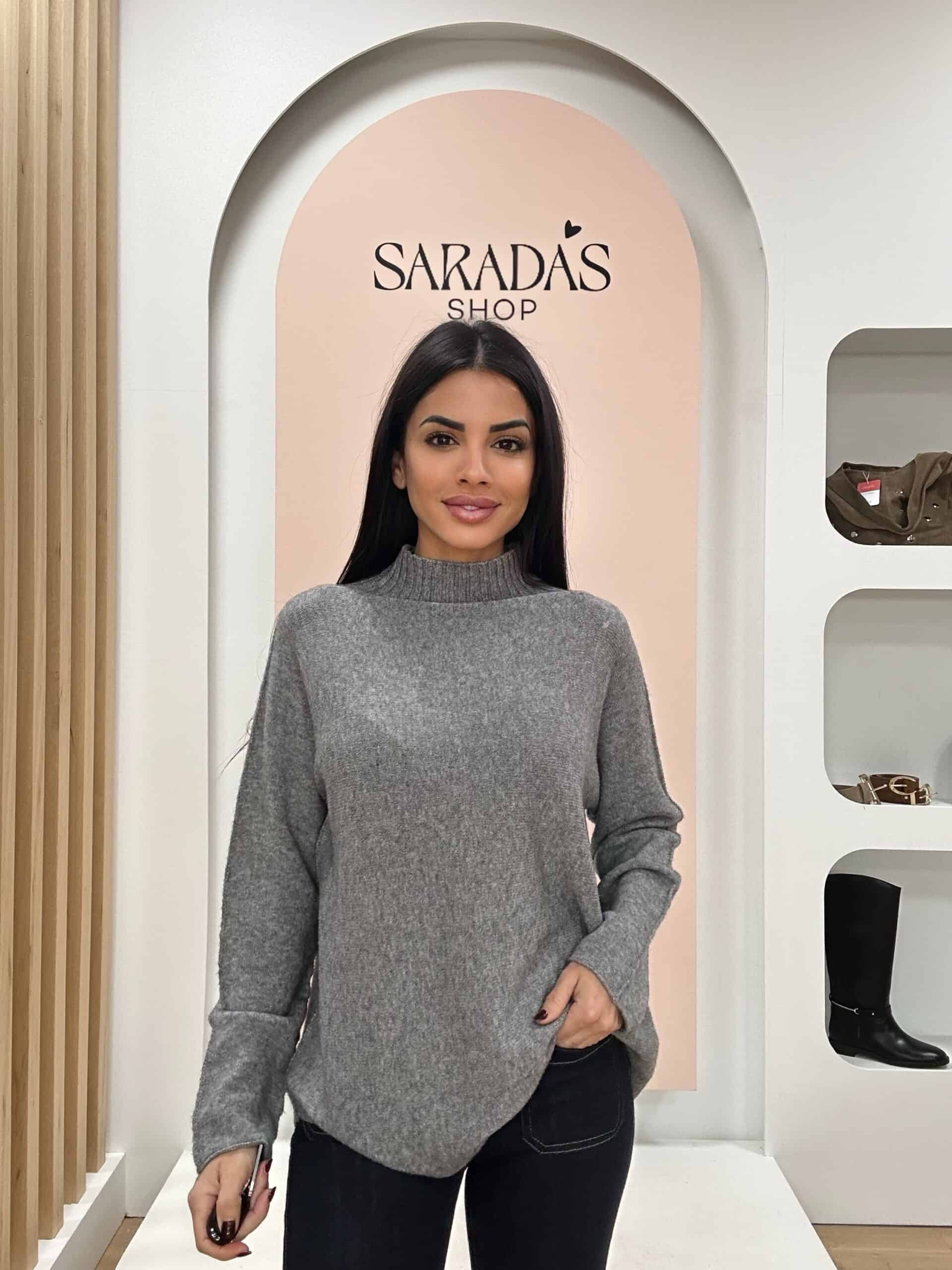Jersey en punto elástico de colo gris, pequeño cuello alto en canalé, corte recto, detalle de costura en mangas, bajo redondeado.