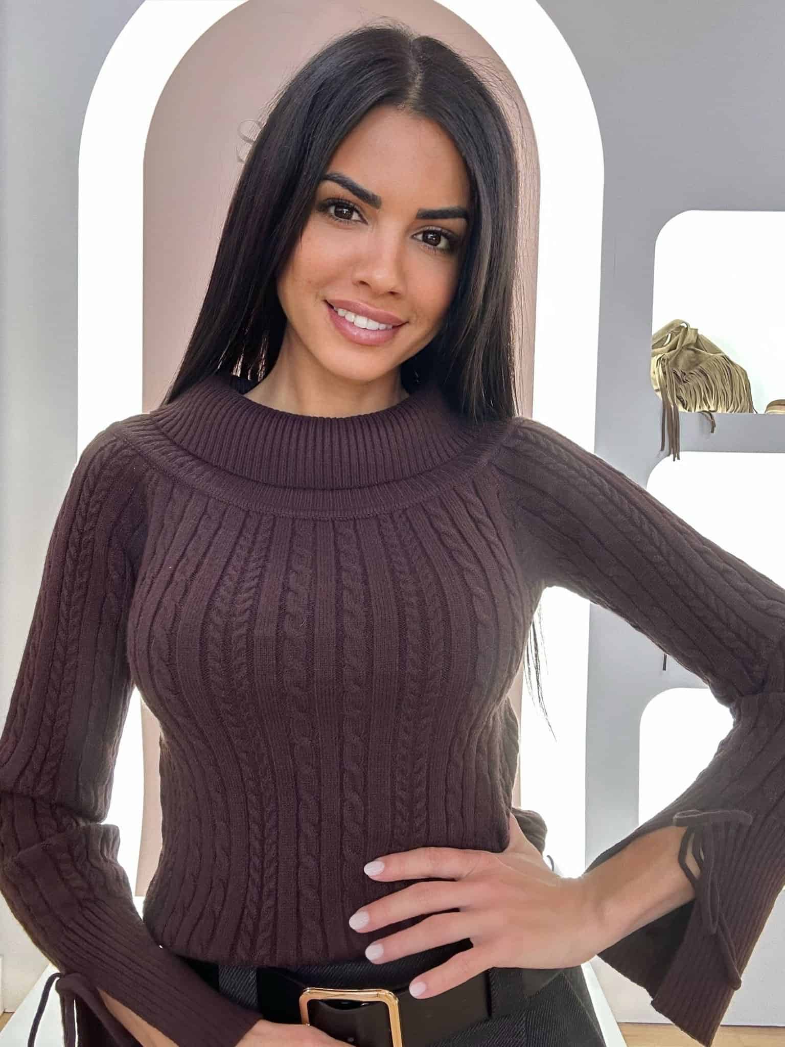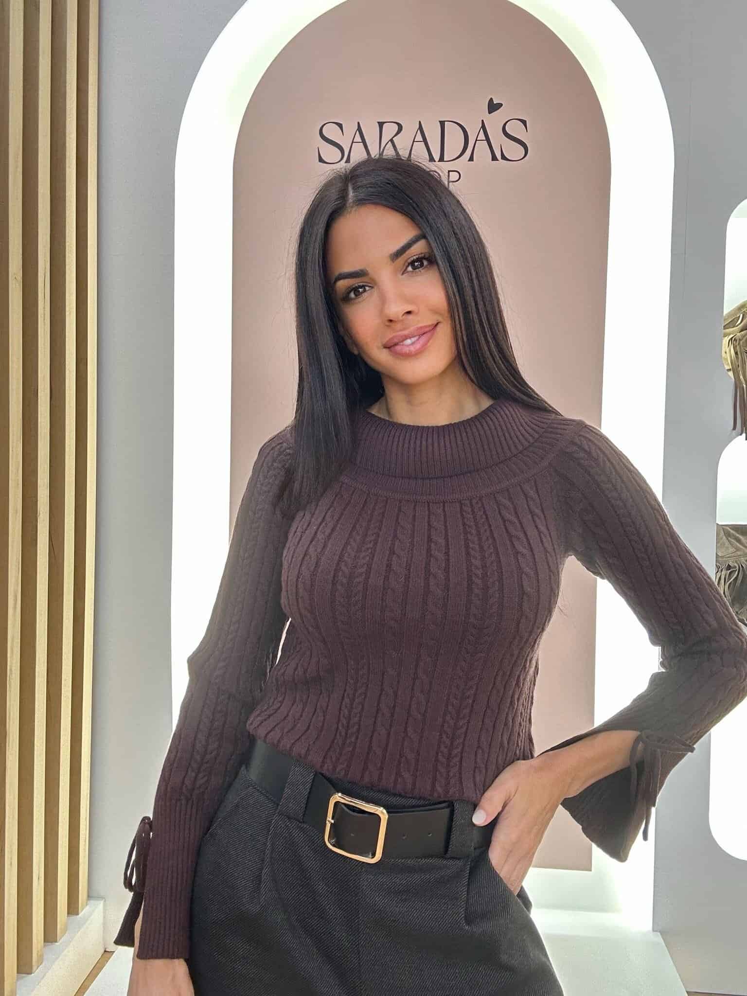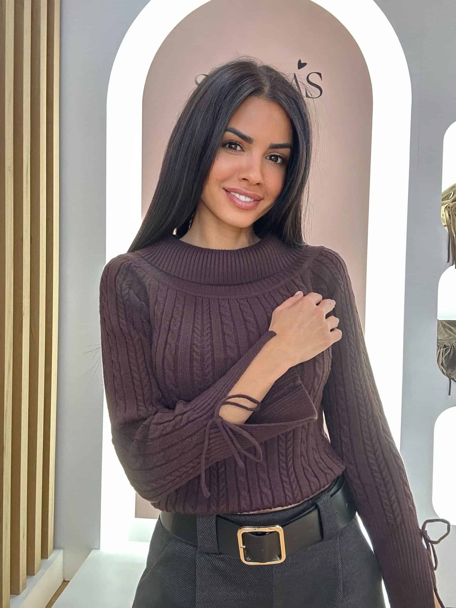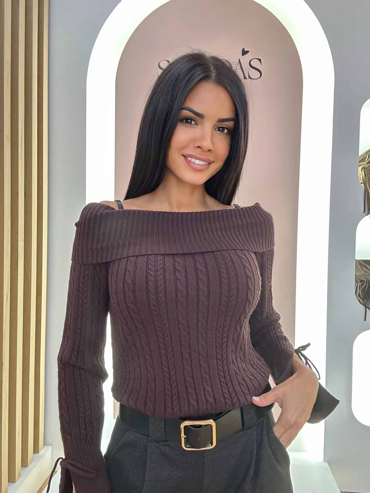 Jersey en punto elástico trenzado de color chocolate, cuello barco, puños y bajo en canalé, detalle de abertura en los puños con lazada. Talla única (S/M/L)
