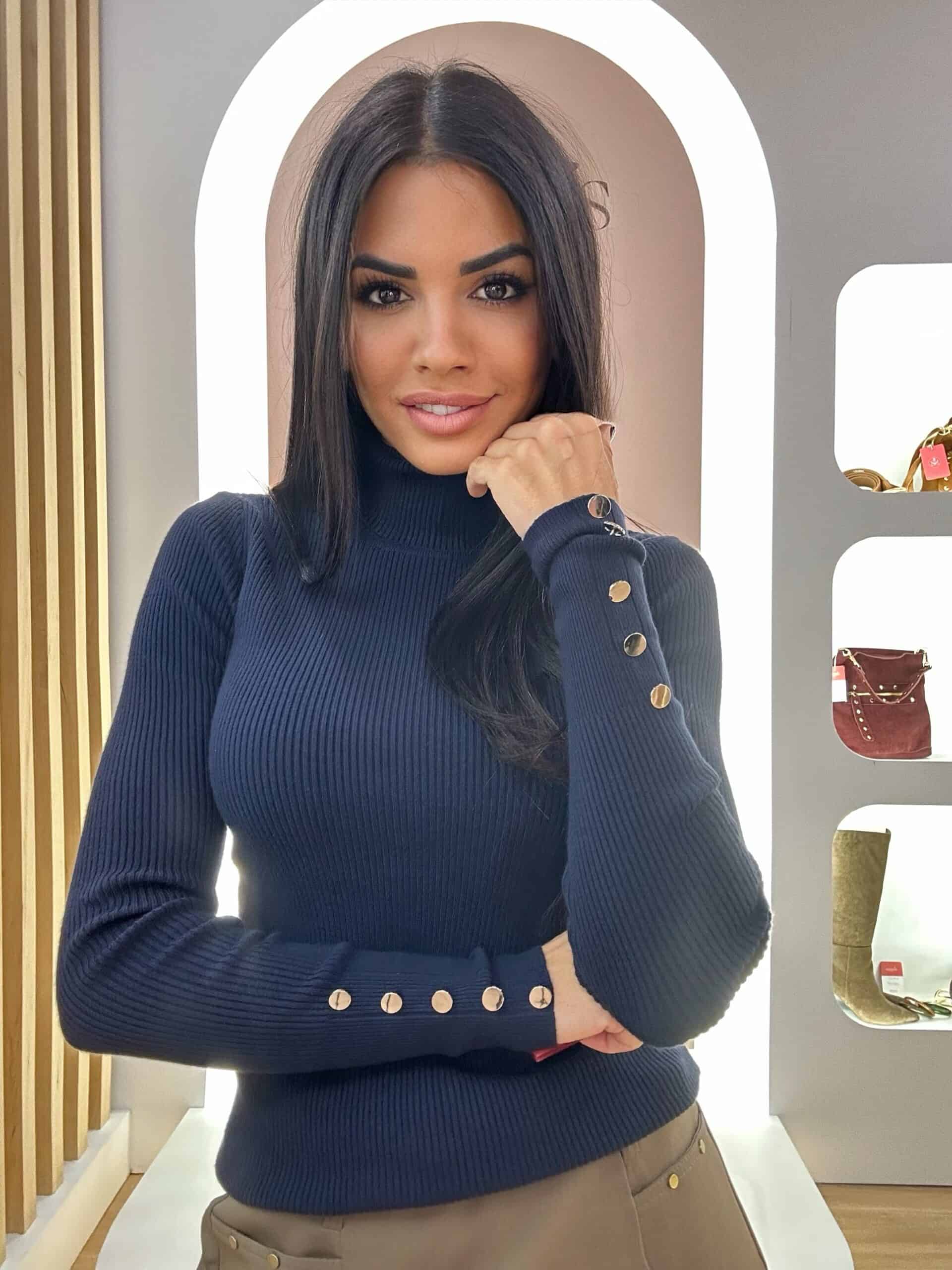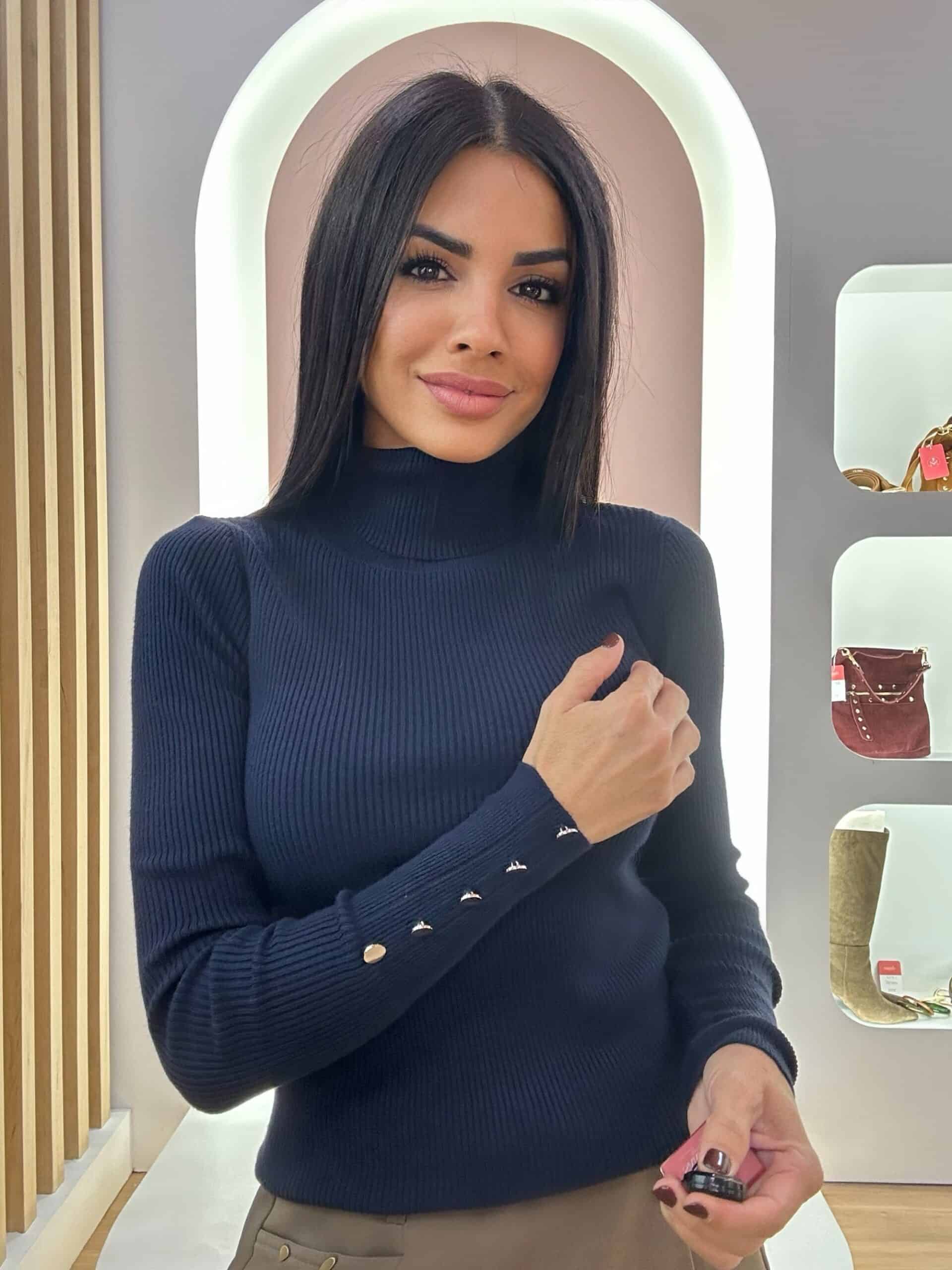 Jersey en punto elástico en canalé, de color azul marino, cuello vuelto, detalle de falsa botonadura en puños, de color plateado.