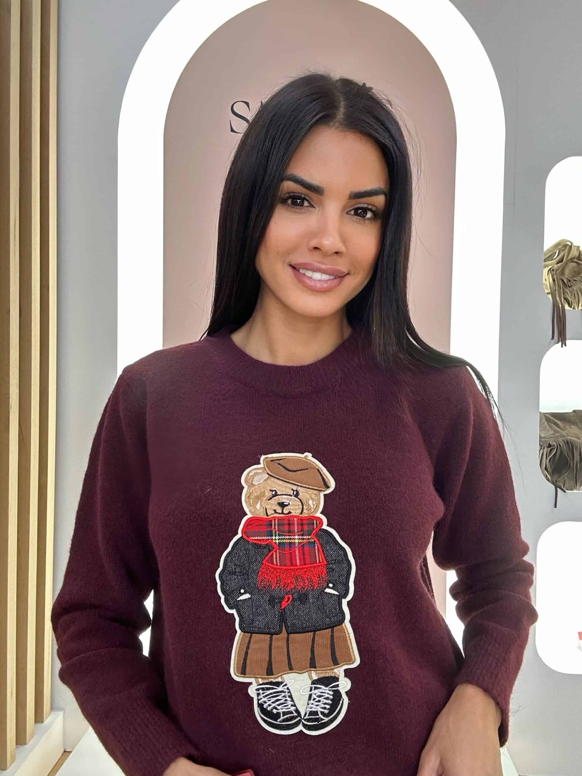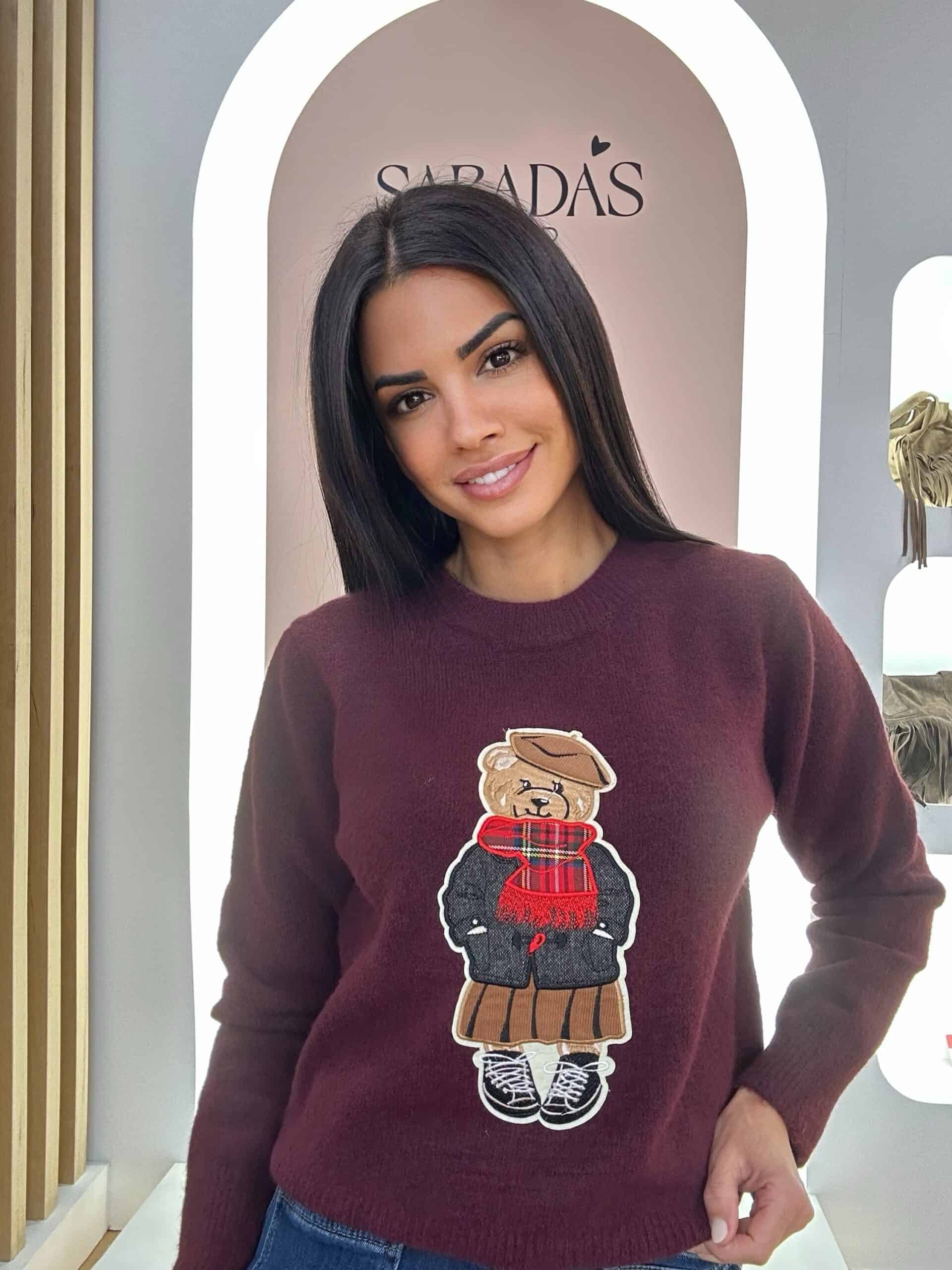 sey en punto elástico de color burdeos, cuello redondo, puños y bajo en canalé, detalle oso. Talla única (S/M/L) Medidas que te pueden interesar: Sisa: 49cm. (sin estirar), largo desde la sisa: 33cm. 50%Poliamida. 35%Viscosa. 10%Lana. 5%Elastan.