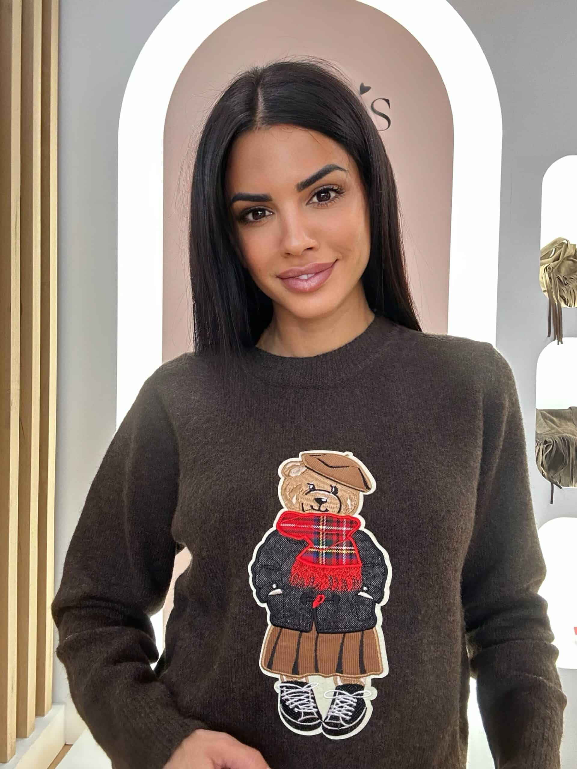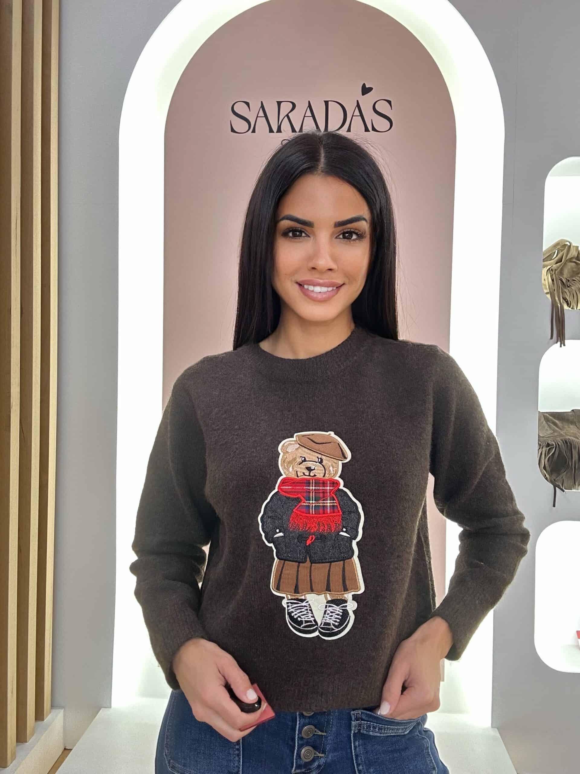 Jersey en punto elástico de color chocolate, cuello redondo, puños y bajo en canalé, detalle oso.