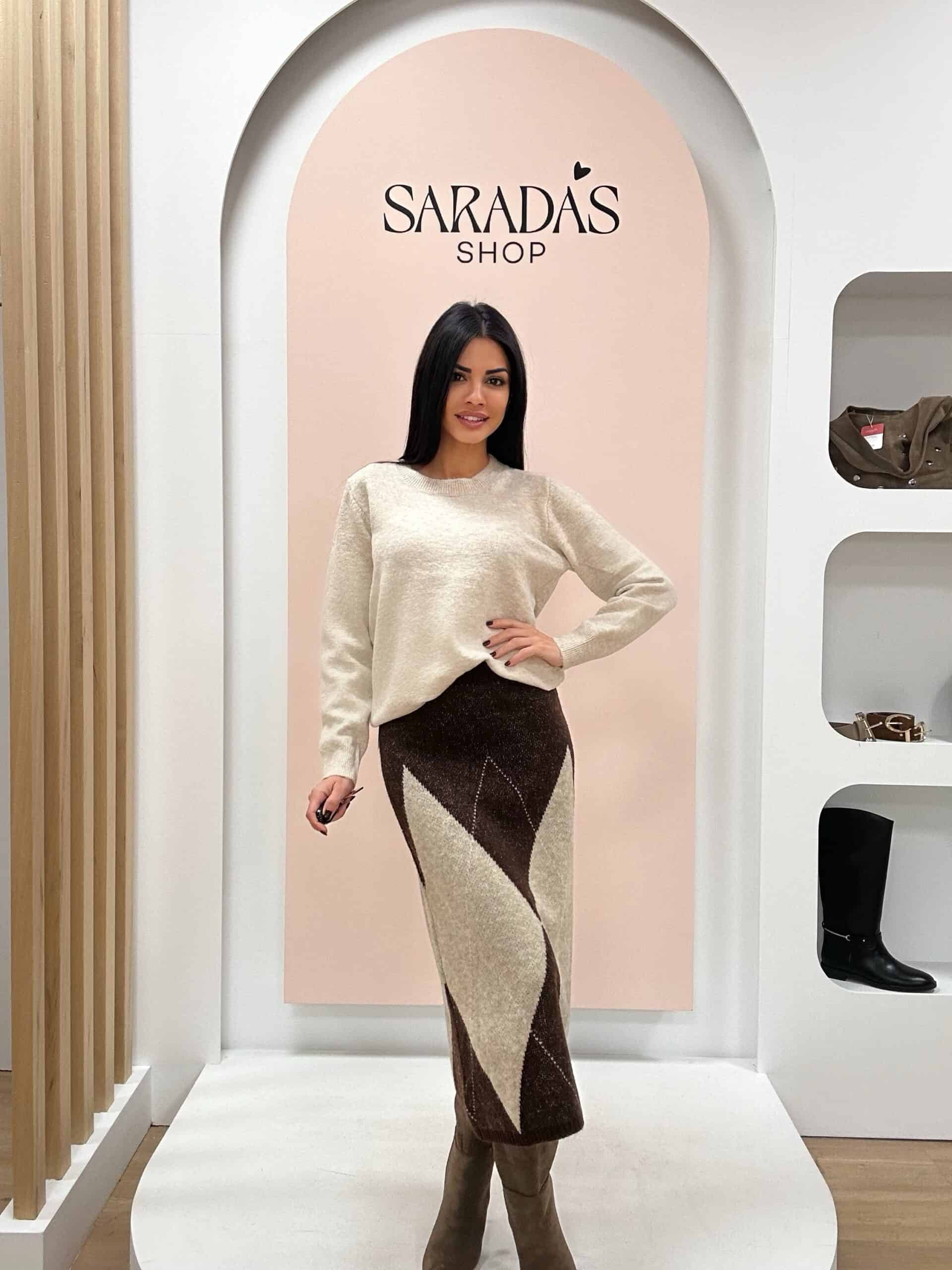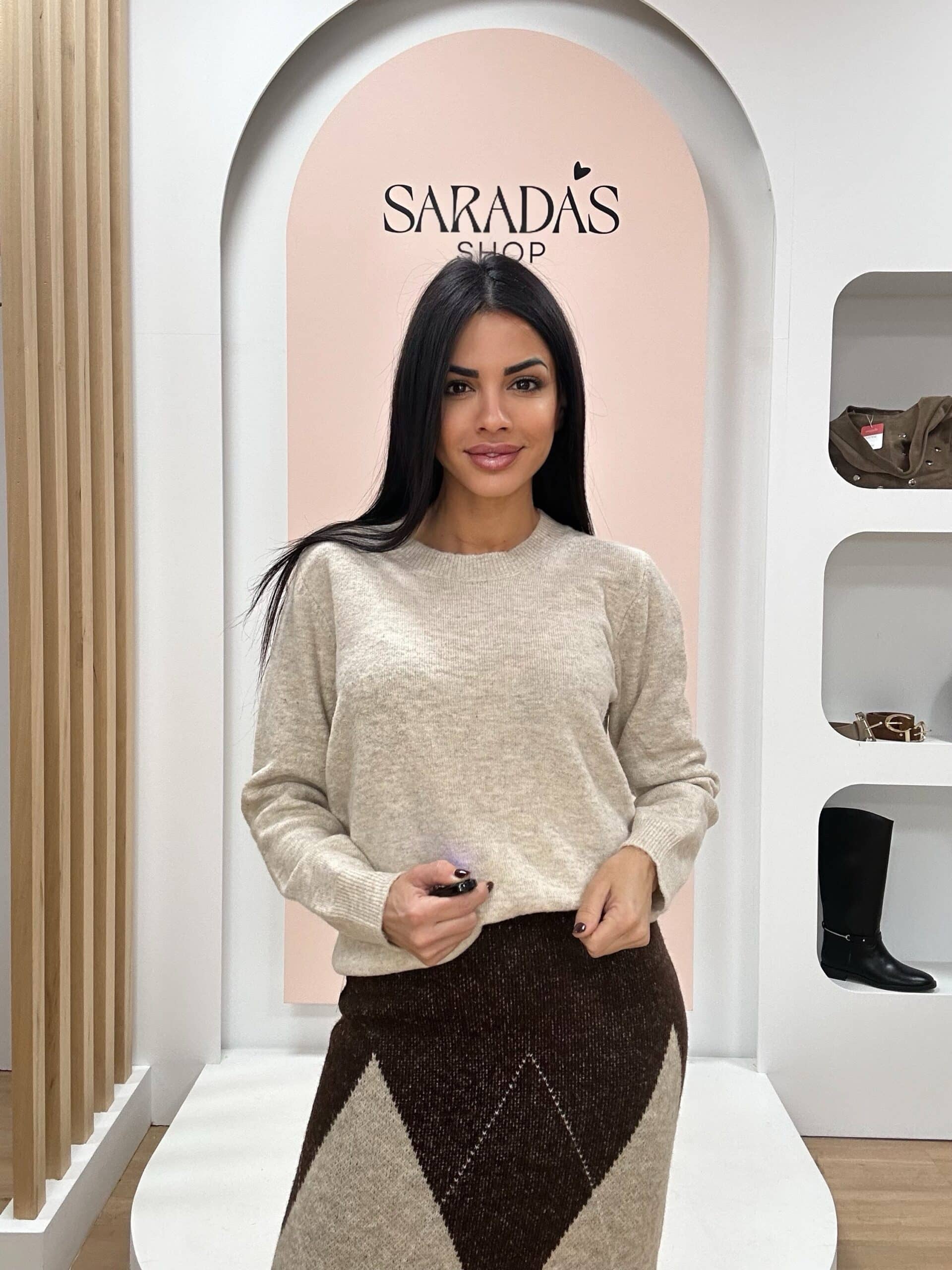 Jersey en punto elástico de color beige, cuello redondo, puños y bajo en canalé.
