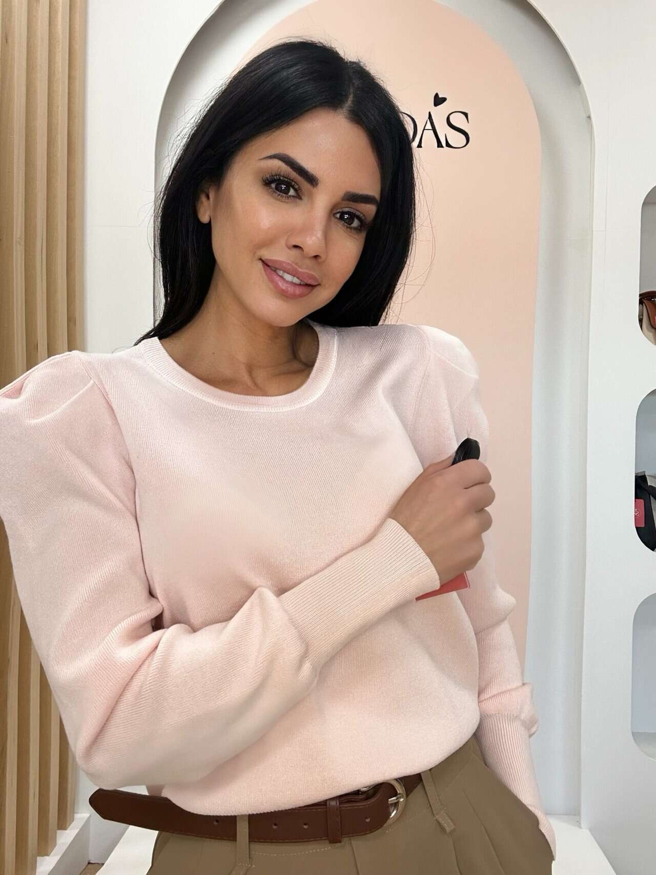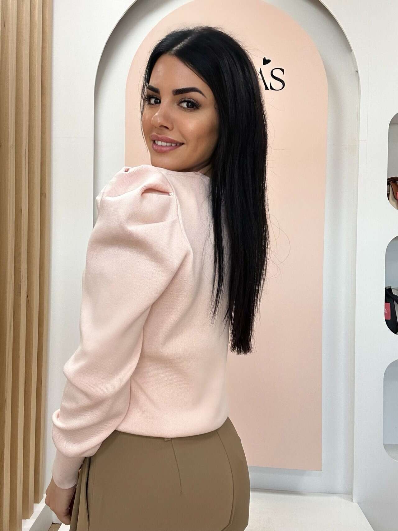 Jersey en punto fino de color rosa pastel, cuello redondo, detalle de mangas ligeramente abullonadas y acanalado en puños largos. y bajo ancho. Talla única: S/M/L Medidas que te pueden interesar: Sisa:45cm. Largo desde sisa: 34cm. 68%Viscosa. 32%Poliéster.