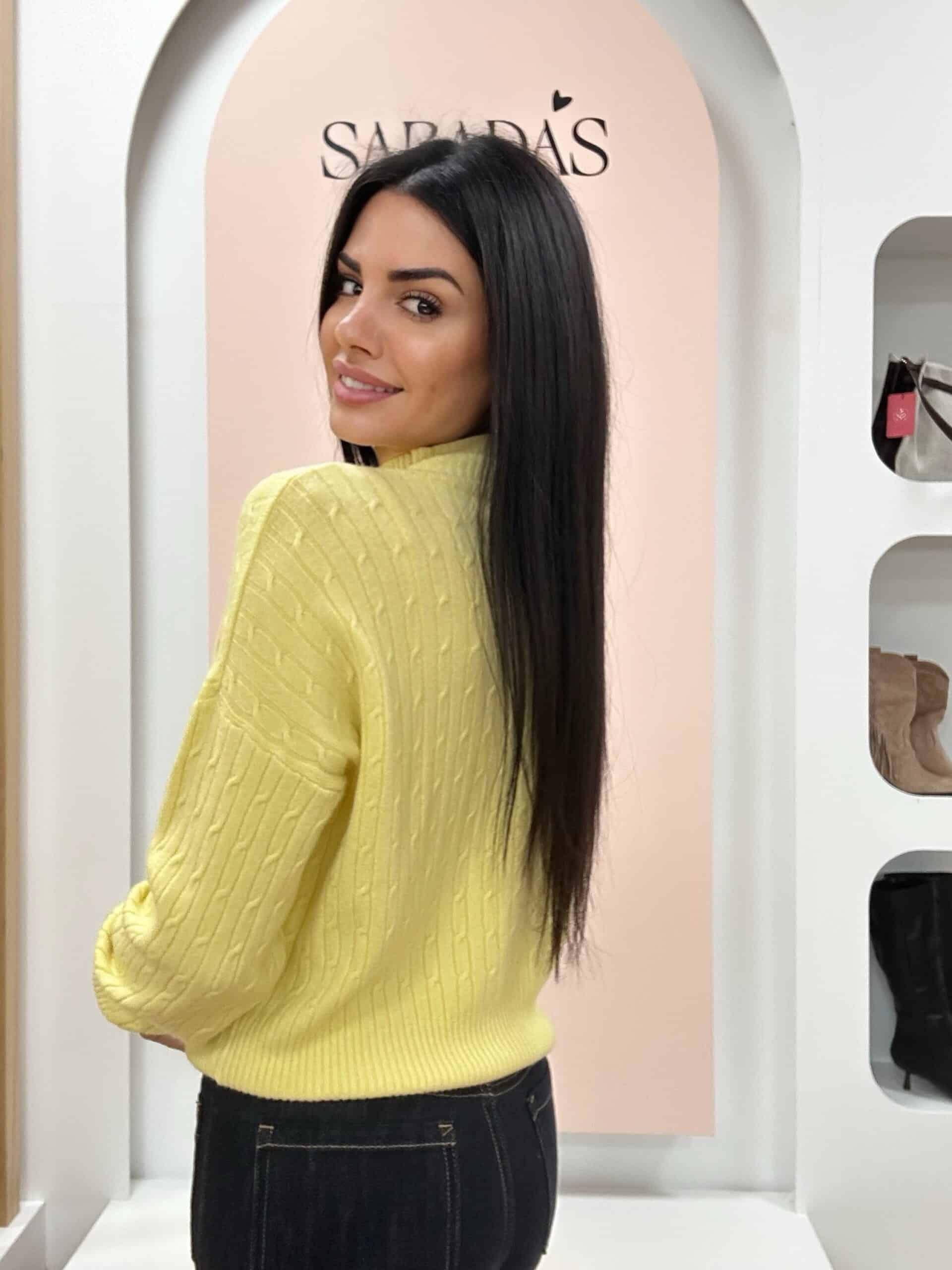 Jersey en punto elástico trenzado de color amarillo pastel, pequeño cuello alto, corte recto, detalle de Canale en cuello, puños y bajo. Talla única (S/M/L) Medidas que te pueden interesar: Sisa: 51cm. (sin estirar), largo desde la sisa:34cm. 52%Viscosa. 26%PBT. 22%Nylon.