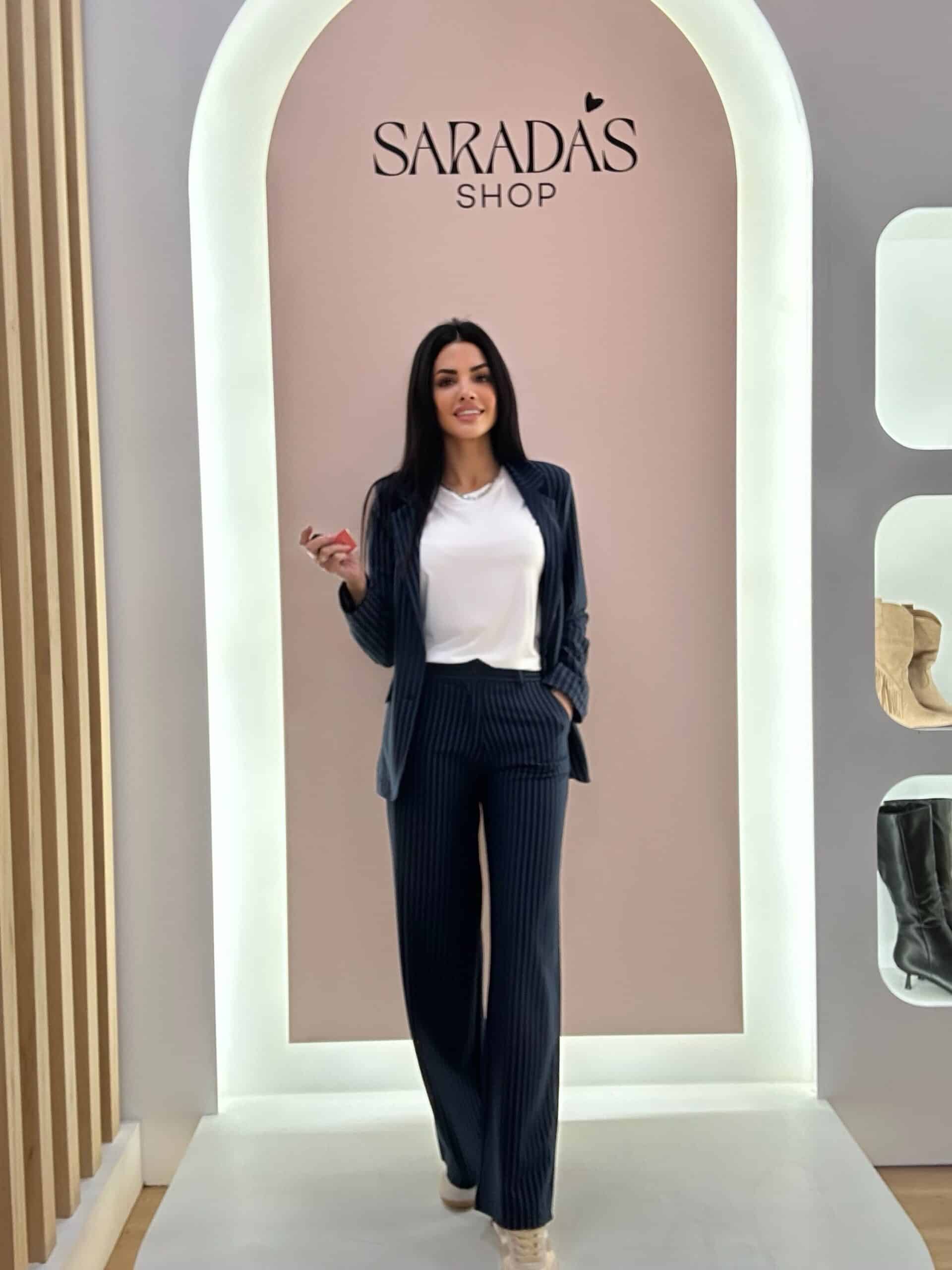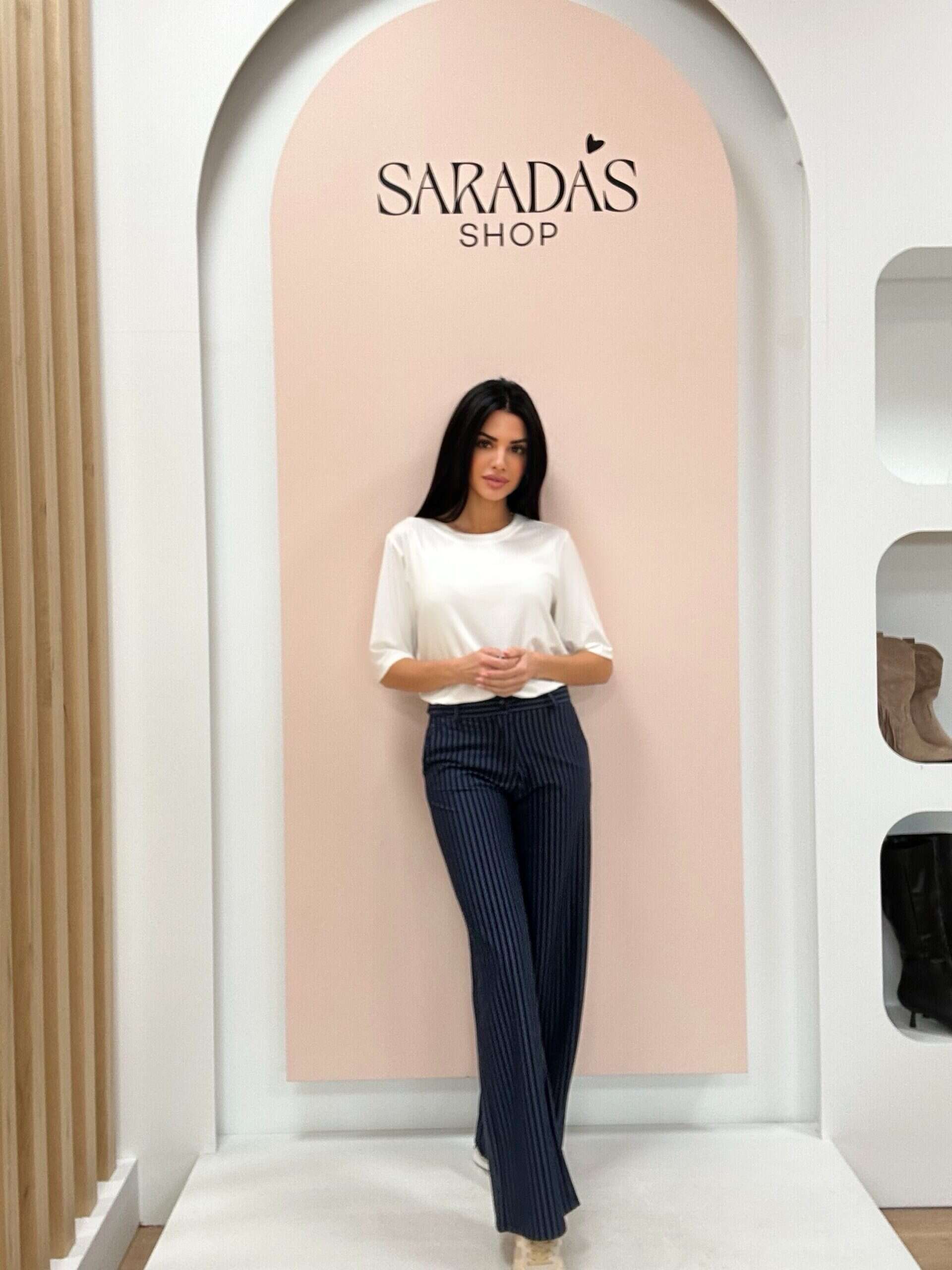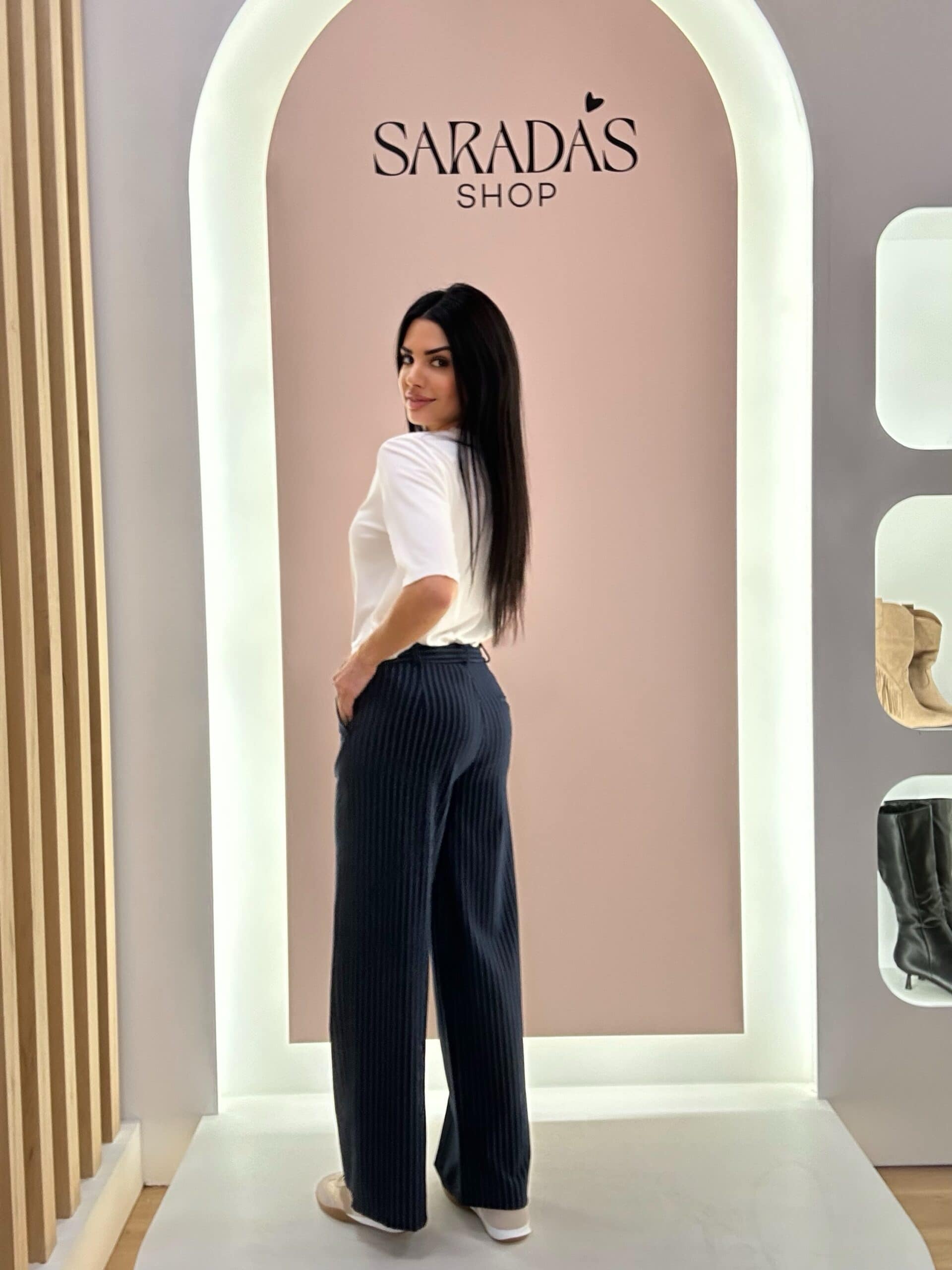 Pantalón largo en color azul marino con patrón de doble raya diplomática en color blanco, cinturilla de cierre con botón y cremallera, bolsillos laterales, corte recto. Diseño Italiano.
