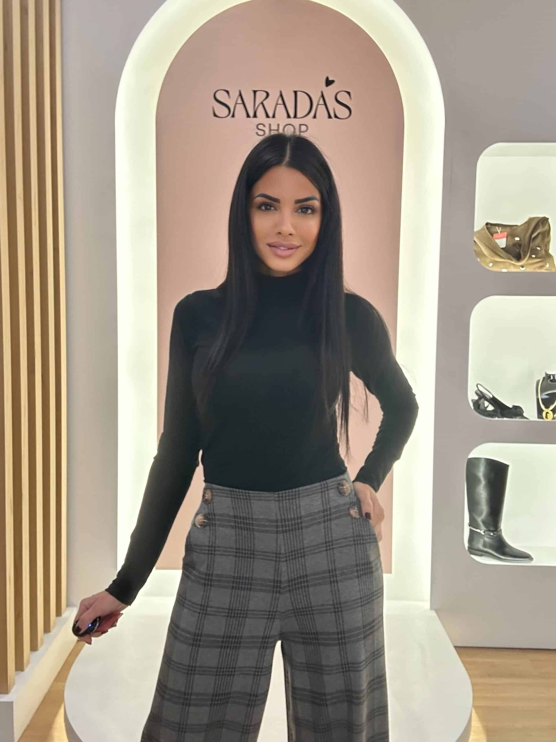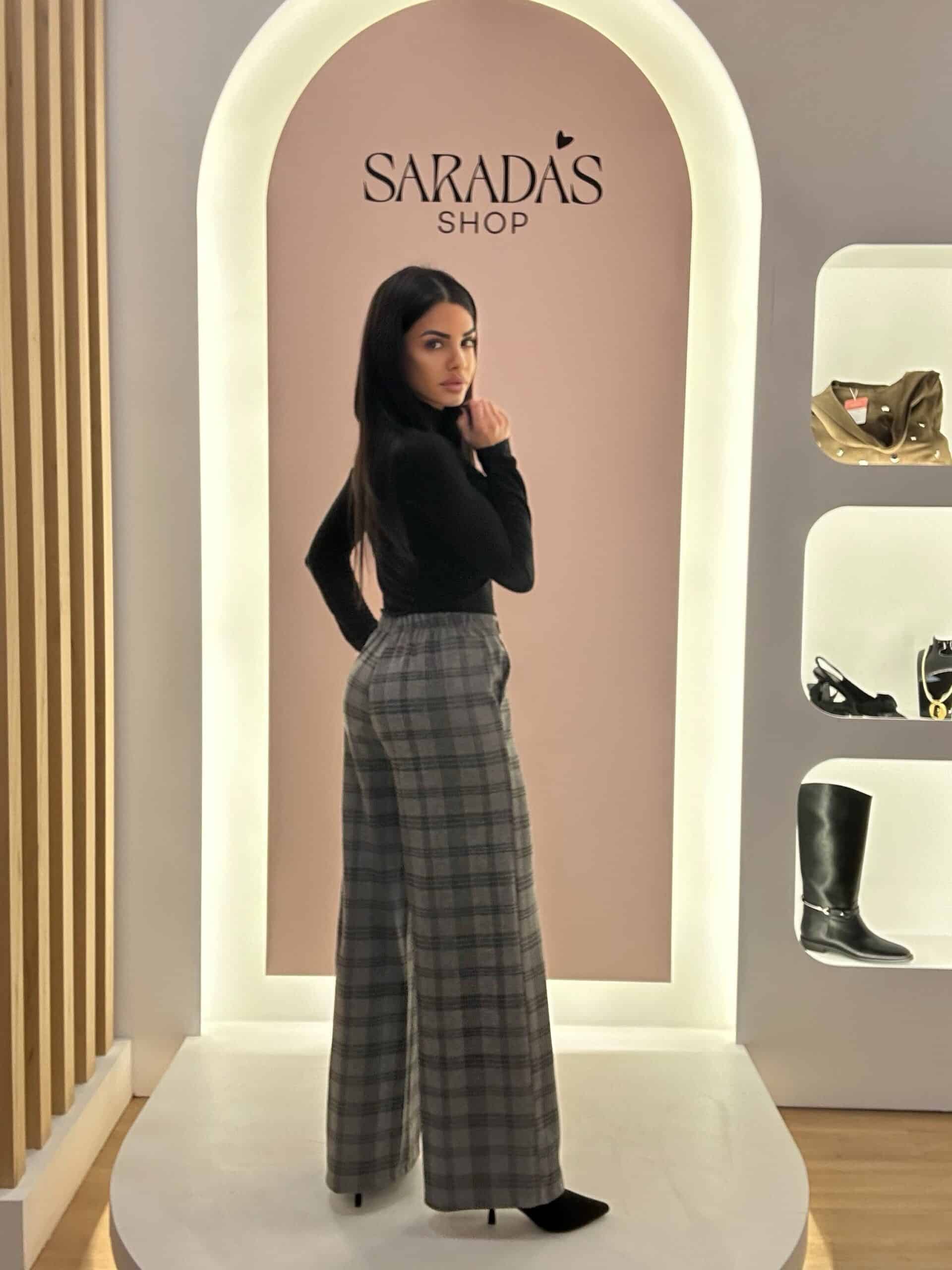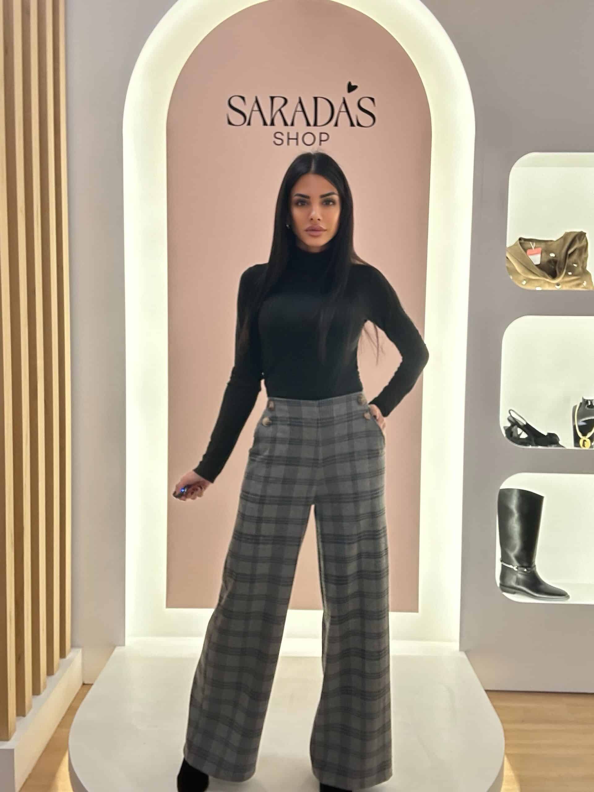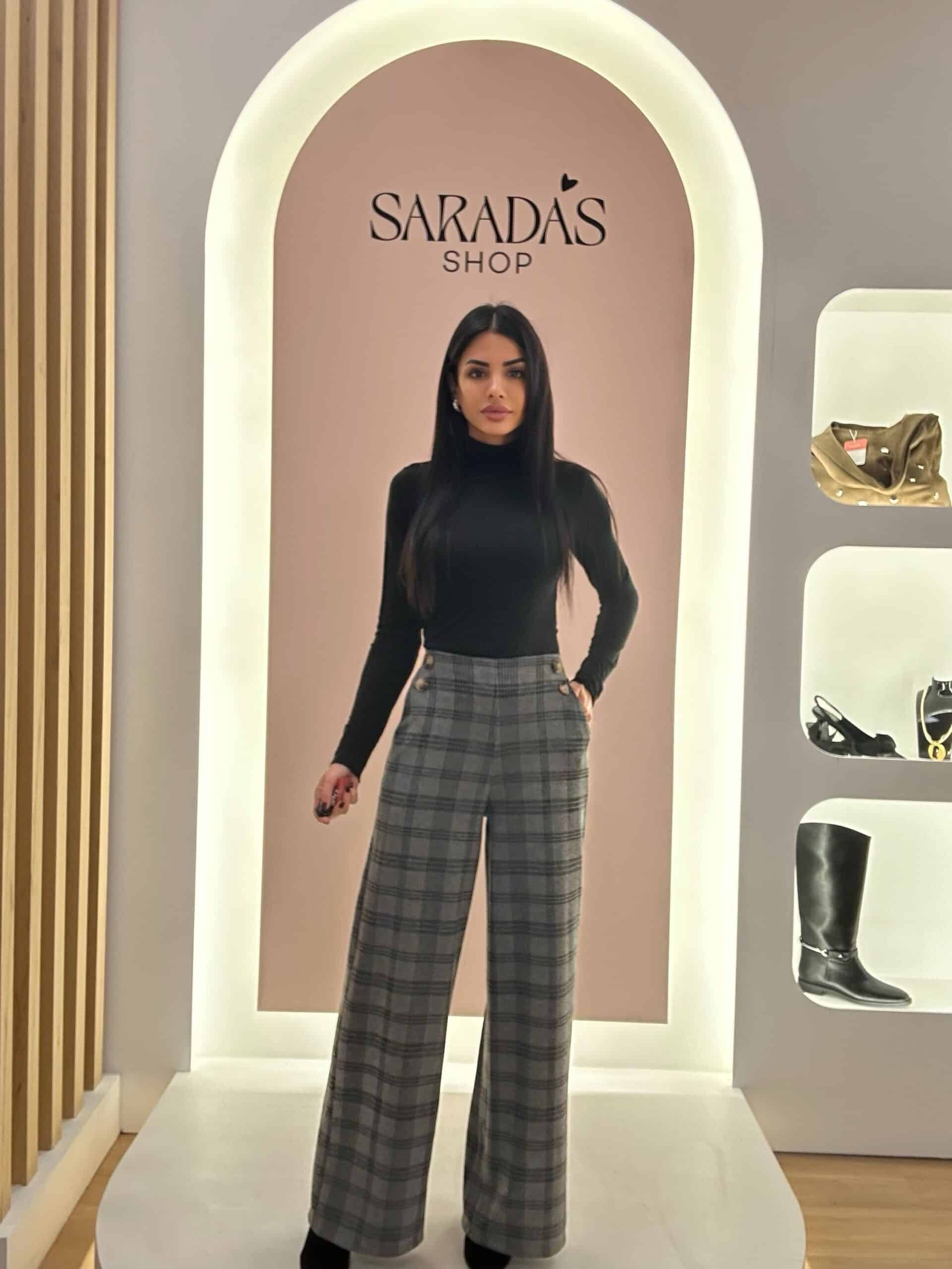 Pantalón en mezcla de color gris oscuro con estampado de cuadro en negro, corte wide leg, tiro medio, cintura con elástico trasero, con detalle de falsos botones laterales en bolsillos. Diseño Italiano.