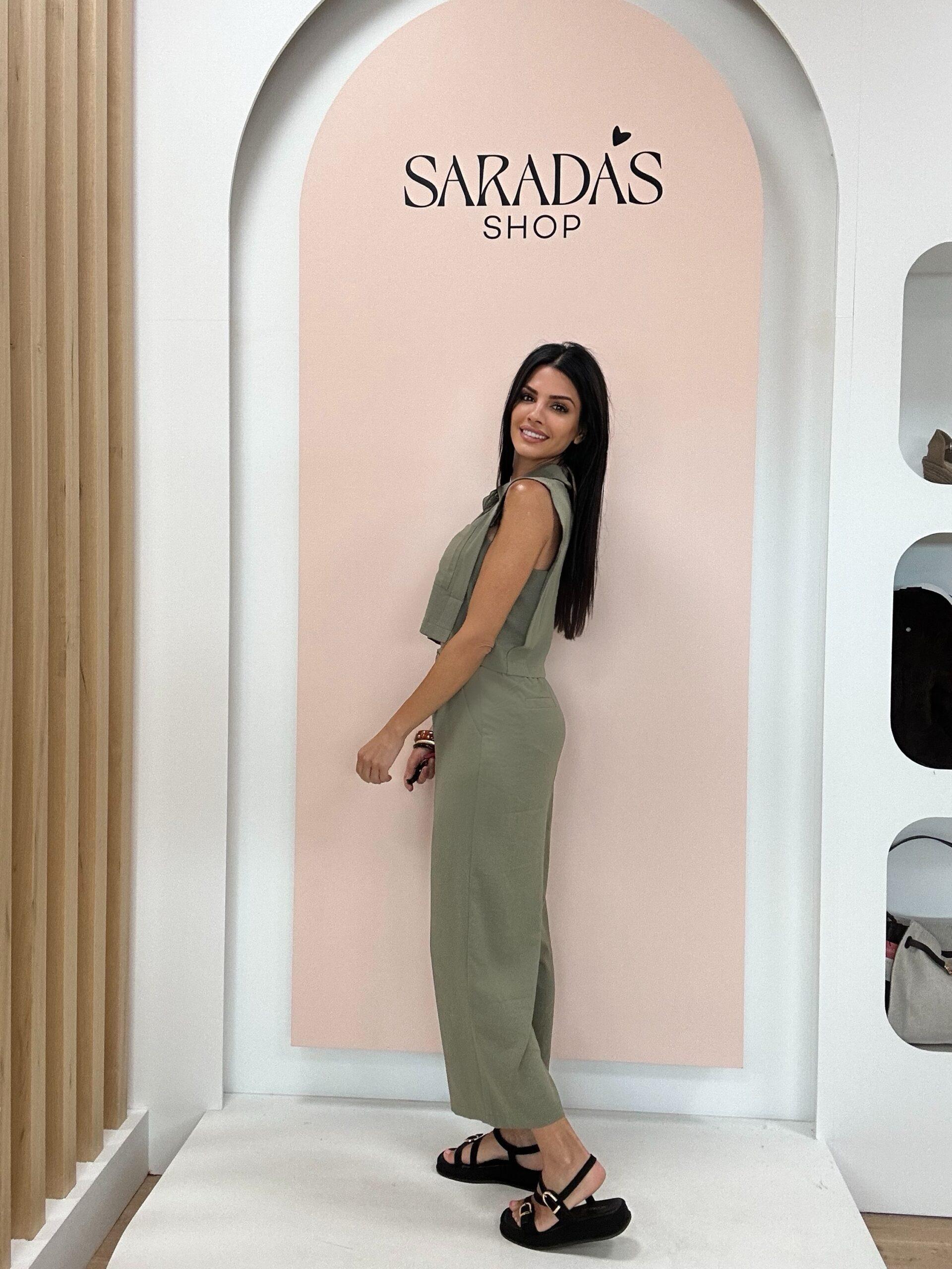 Pantalón en poliéster de color verde oliva, cinturilla con elástico trasero y cierre con botón y cremallera delantero, pinzas y bolsillos laterales, falsos bolsillos traseros, corte largo al tobillo (cropped). Ver camisa poliéster oliva a juego.