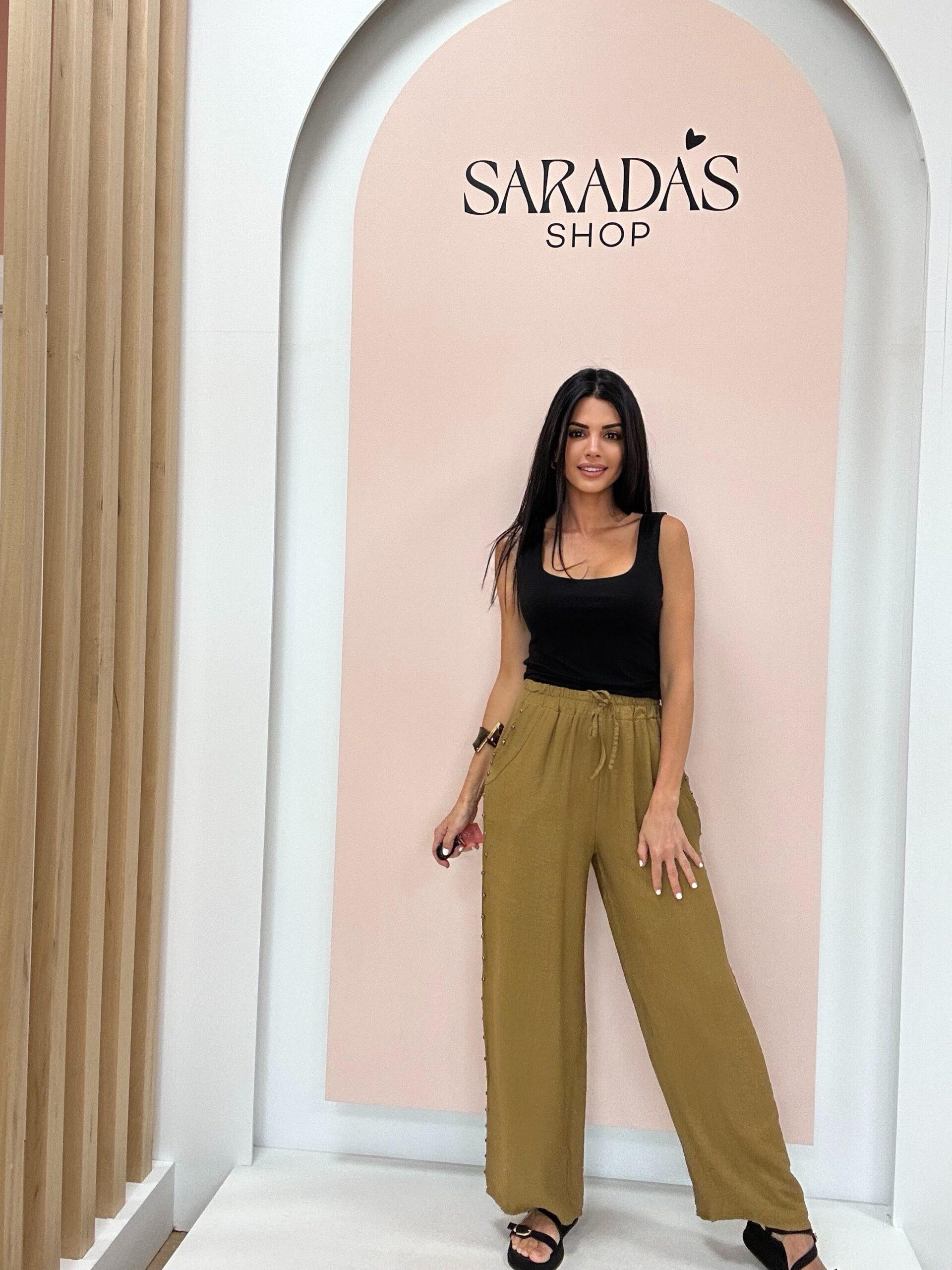 Pantalón en viscosa de color ocre, cinturilla con elástico y falsa lazada, bolsillos laterales, corte recto. y detalle de tachuelas a lo largo de ambas piernas desde el bolsillo. Diseño Italiano.