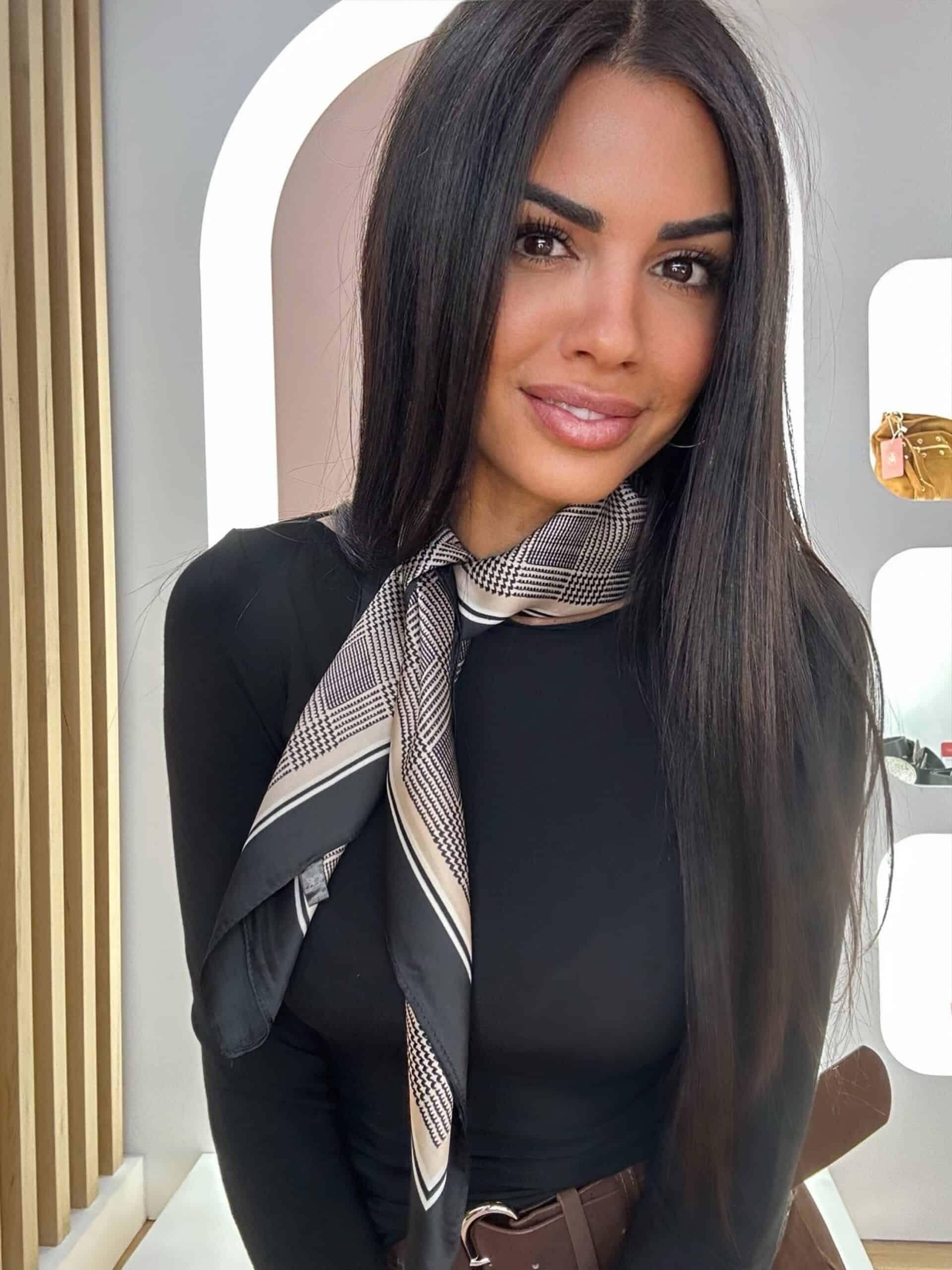Pañuelo con estampado en cuadros en distinta disposición en color negro y beige. Medidas que te pueden interesar: 68X68cm. Las Medidas pueden variar según el punto exacto desde donde se mida. 100%Poliéster.