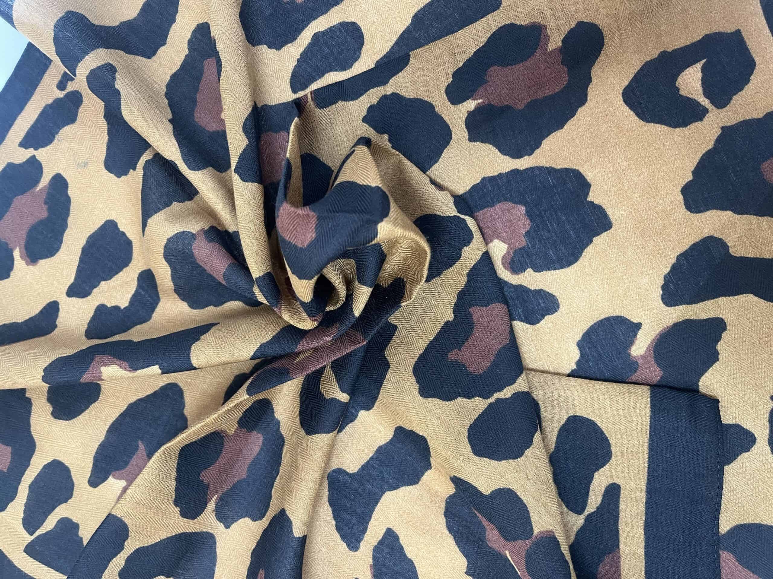 Pañuelo con estampado en animal print de color camel y negro, con detalle de cuadrado negro alrededor. Medidas que te pueden interesar: 67X67cm. Las Medidas pueden variar según el punto exacto desde donde se mida.