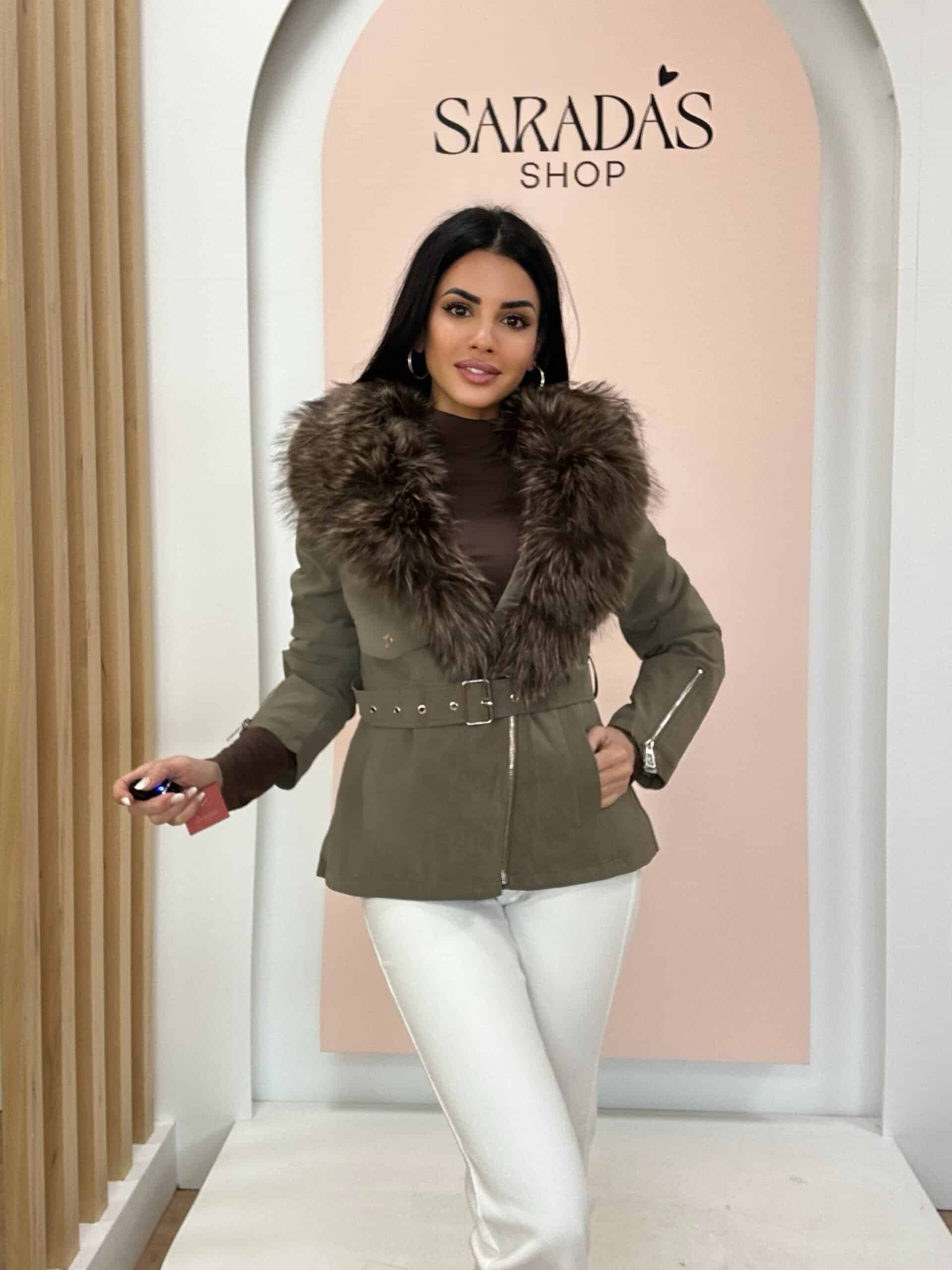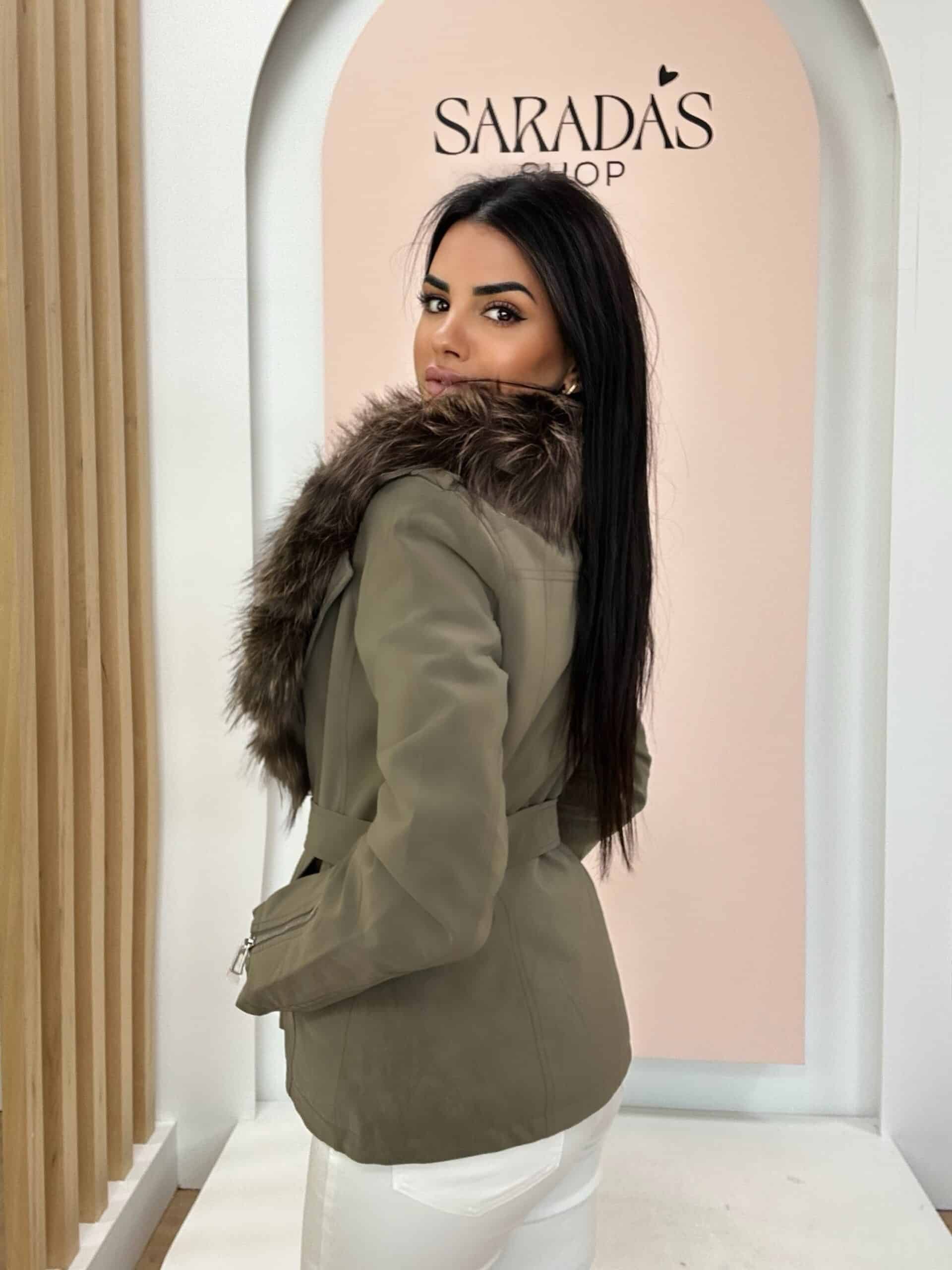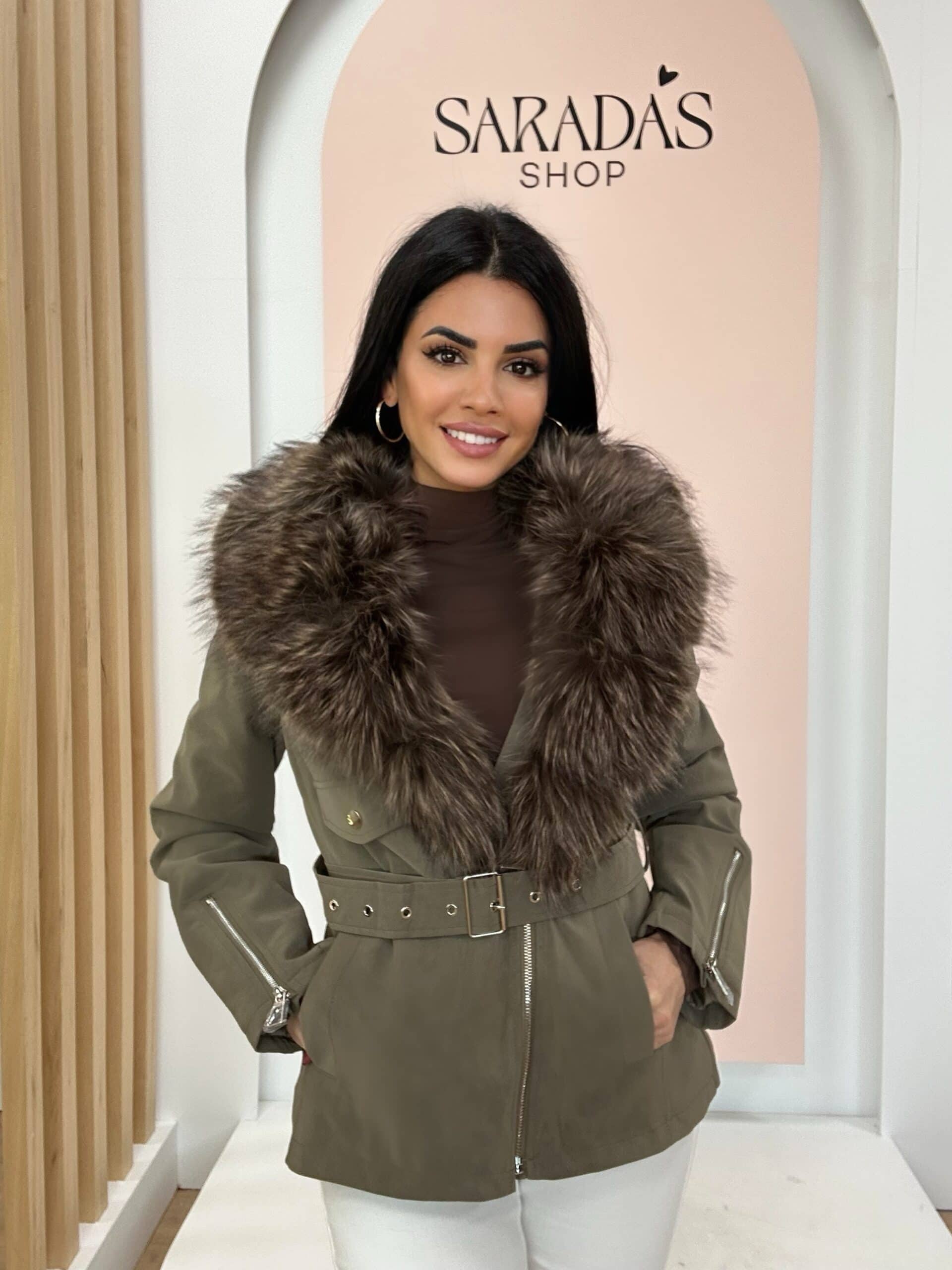 Parka totalmente forrado, en color topo verdoso, cuello en solapa con detalle de pelo extraible, cierre cruzado con cremallera en plateado,falso bolsillo lateral con pequeña solapa, y bolsillos laterales, cremallera en puños, incluye cinturón ajustable