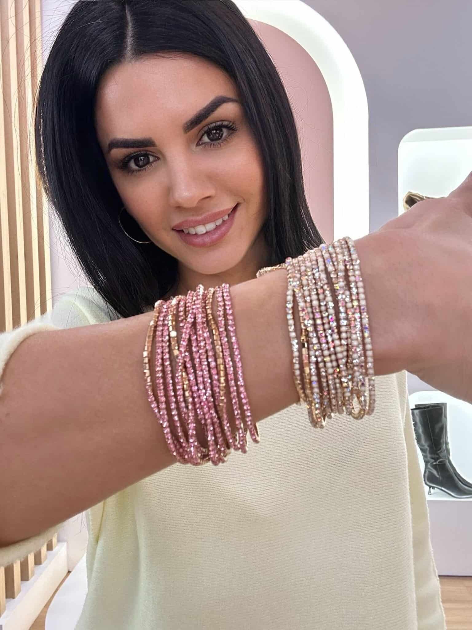 Conjunto de pulseras elásticas de cristales en color rosa pastel y dorado. 12 unidades en cada conjunto. También disponible en crema. Crista-Cobre.
