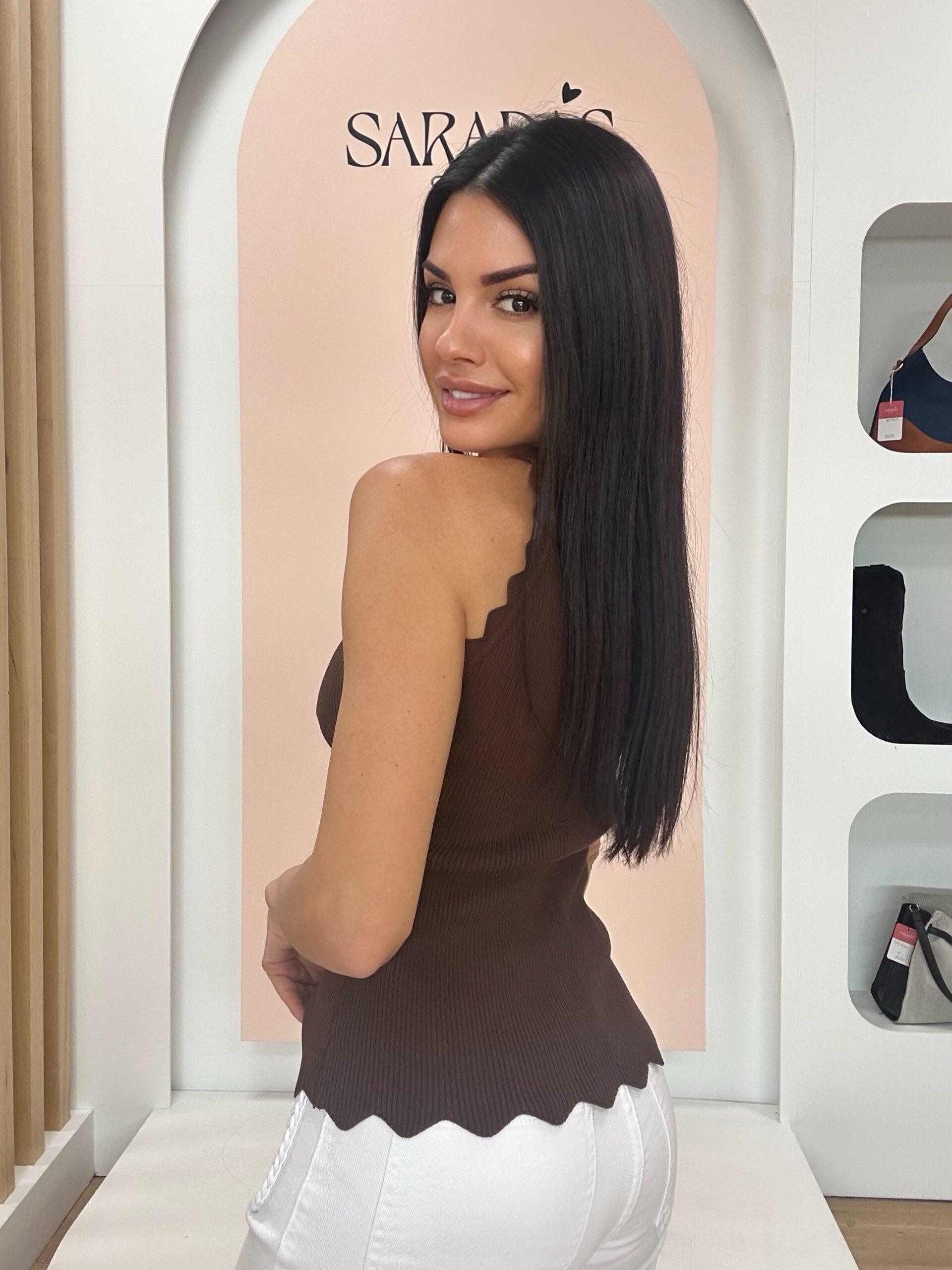 Top en canalé de color marrón chocolate, cuello redondo, tirante, detalle de ondas en todo el contorno. Elige tu talla: S/M(34/36), M/L(38/40) 68%Viscosa. 32%Poliéster.
