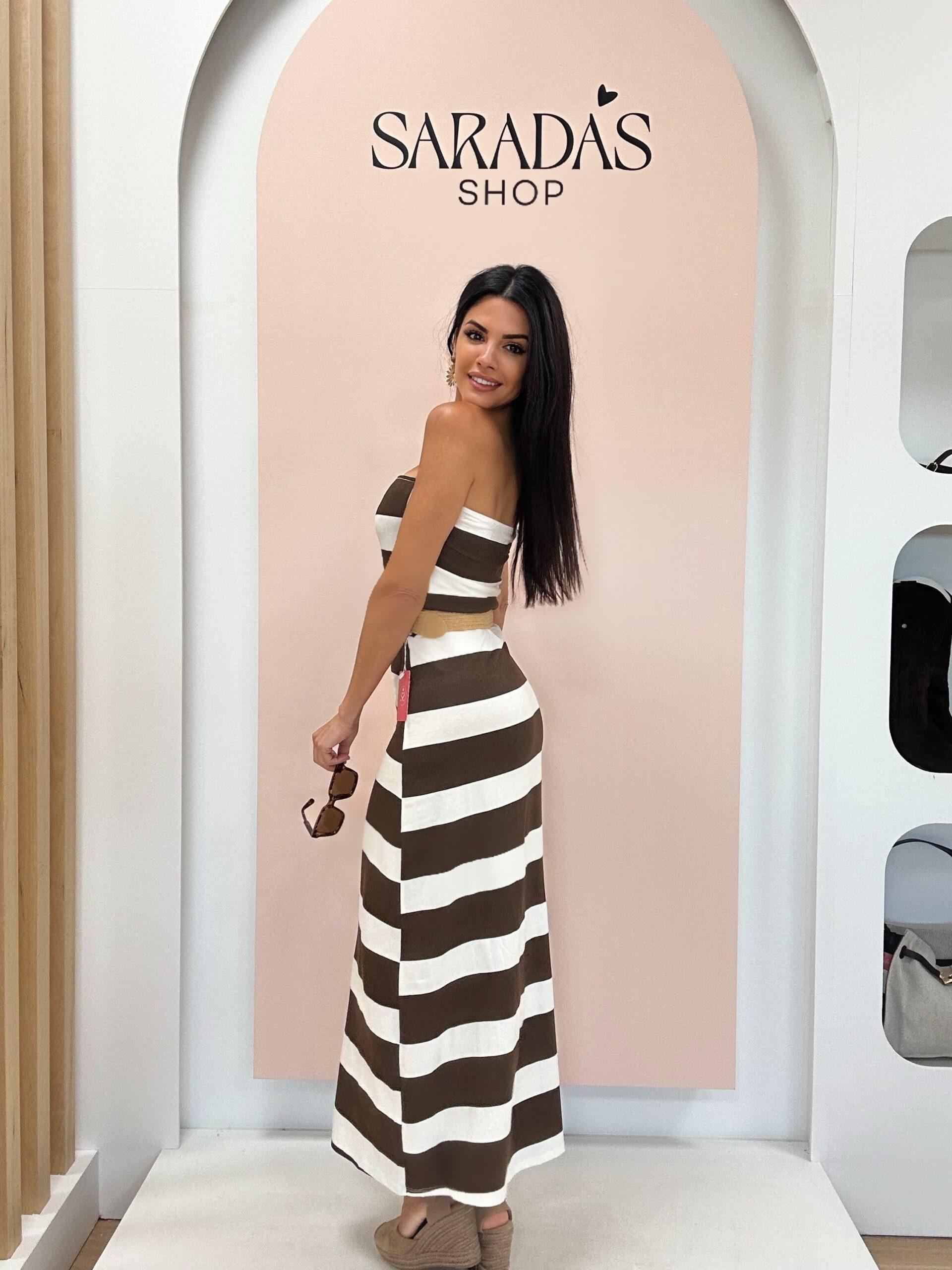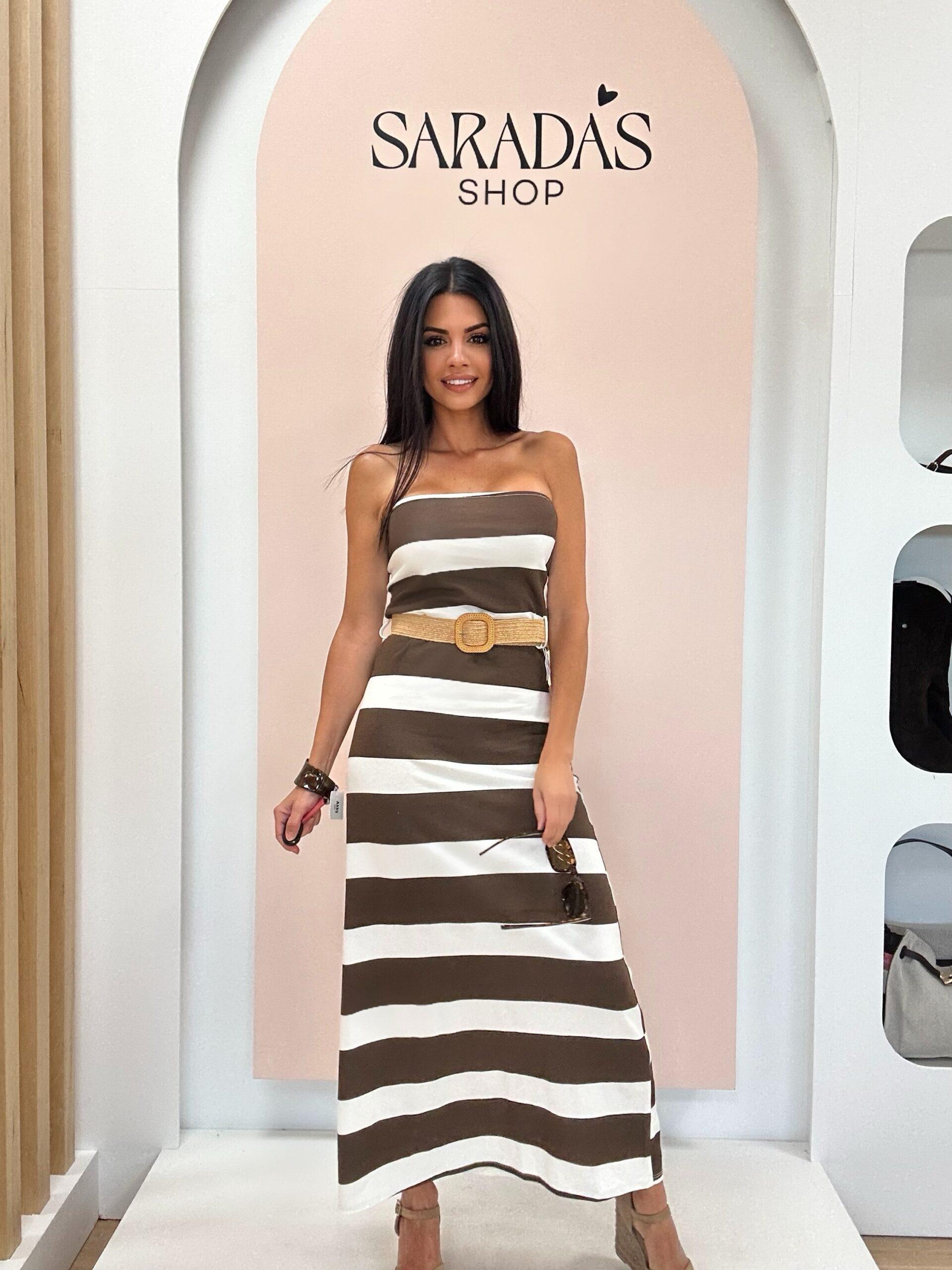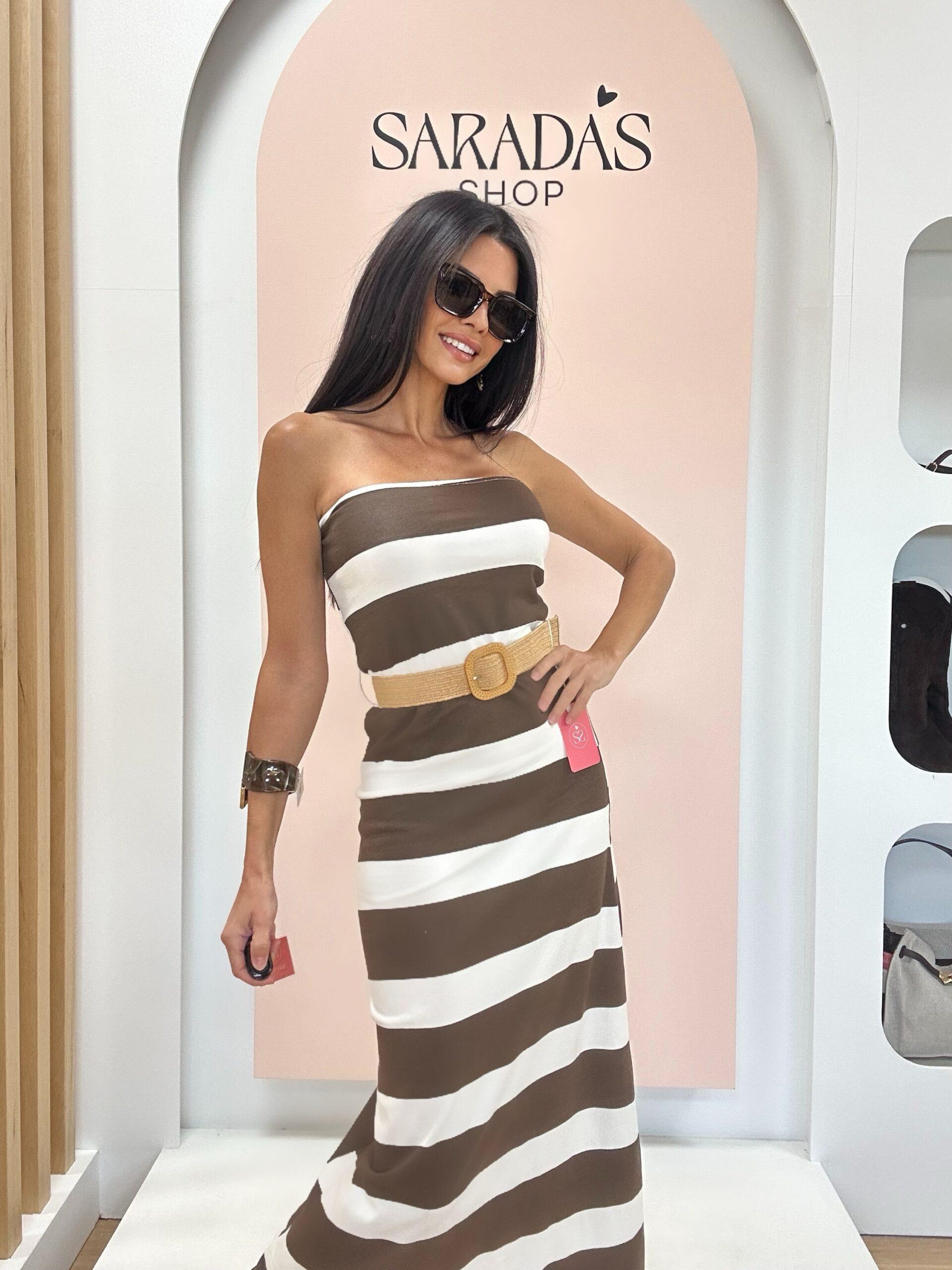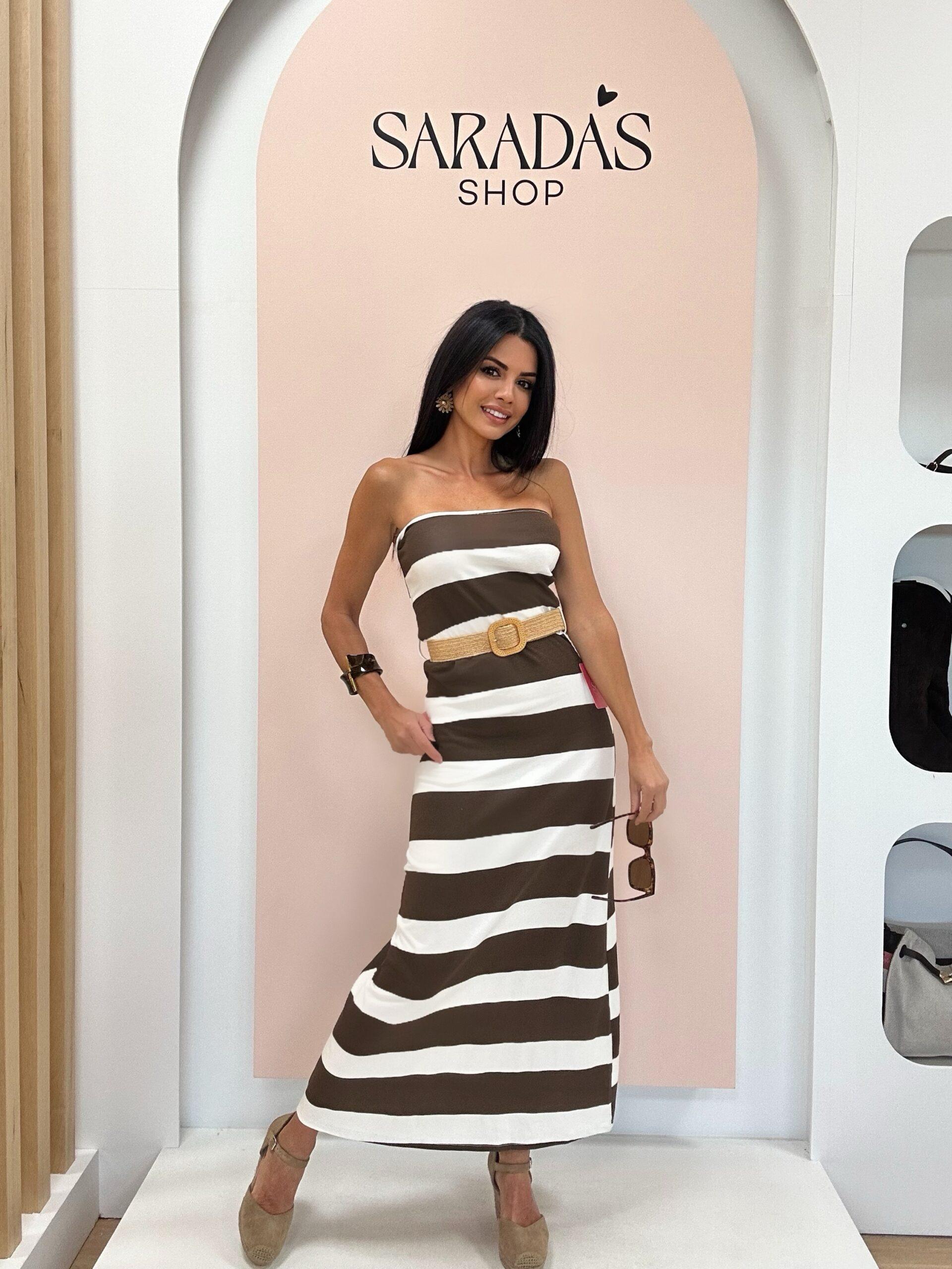 Vestido largo en palabra de honor de algodón, con patrón de rayas de color chocolate y blanco, con detalle de cinturón de rafia camel con hebilla cuadrada incluido.