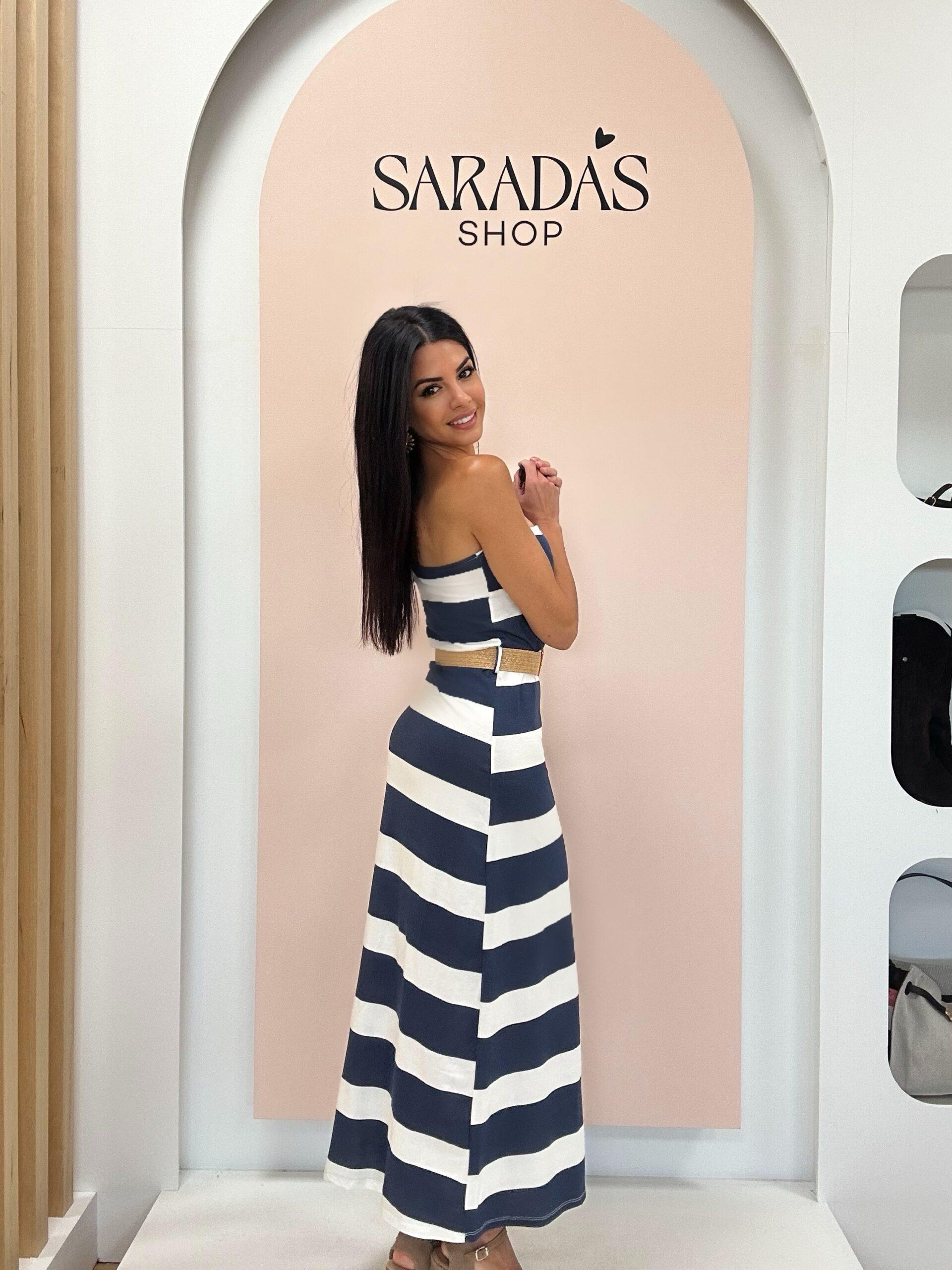 Vestido largo en palabra de honor de algodón, con patrón de rayas de color azul marino y blanco, con detalle de cinturón de rafia camel con hebilla cuadrada incluido. Talla única S/M/L 90%Algodón. 10%Elástico.