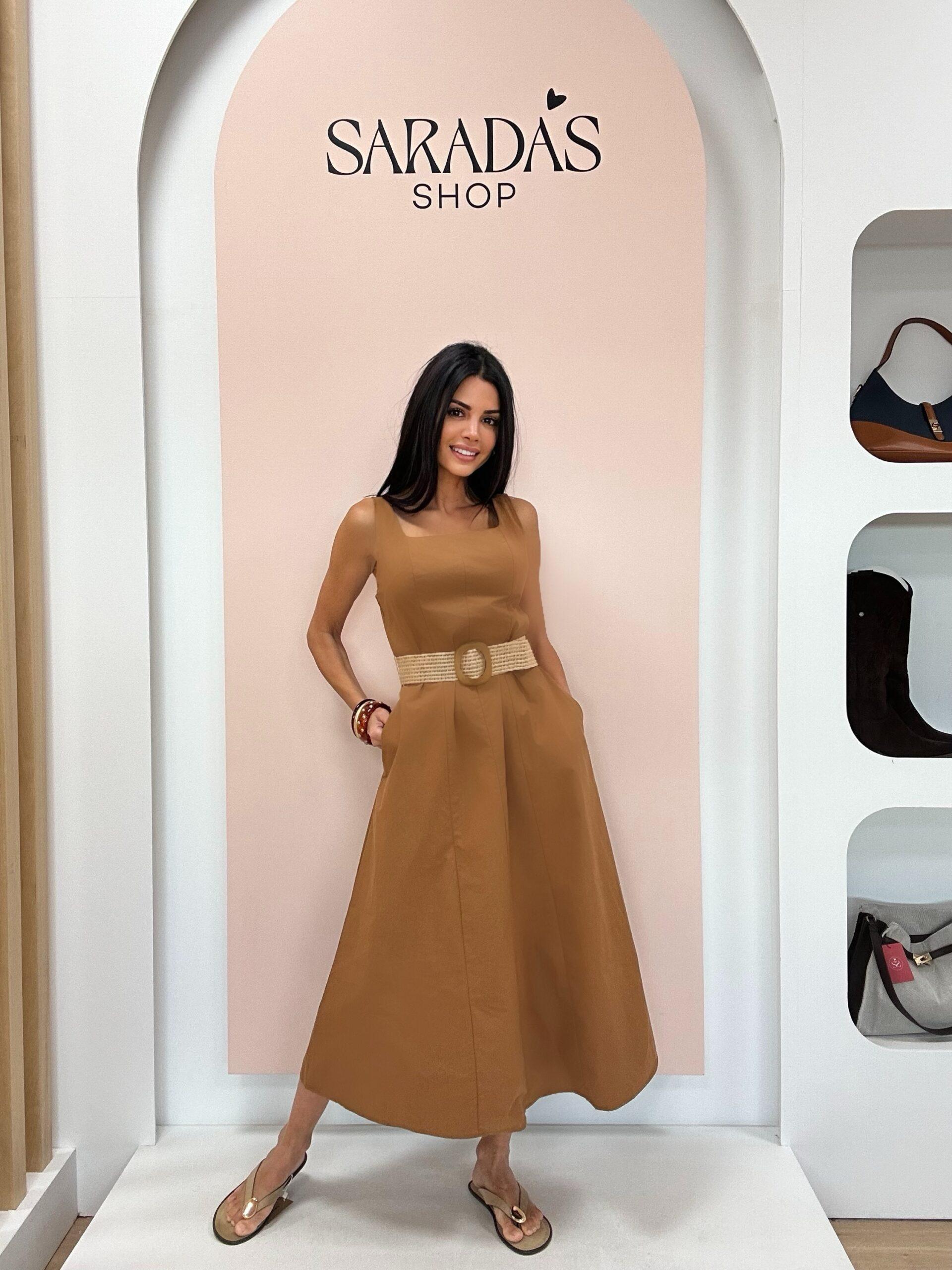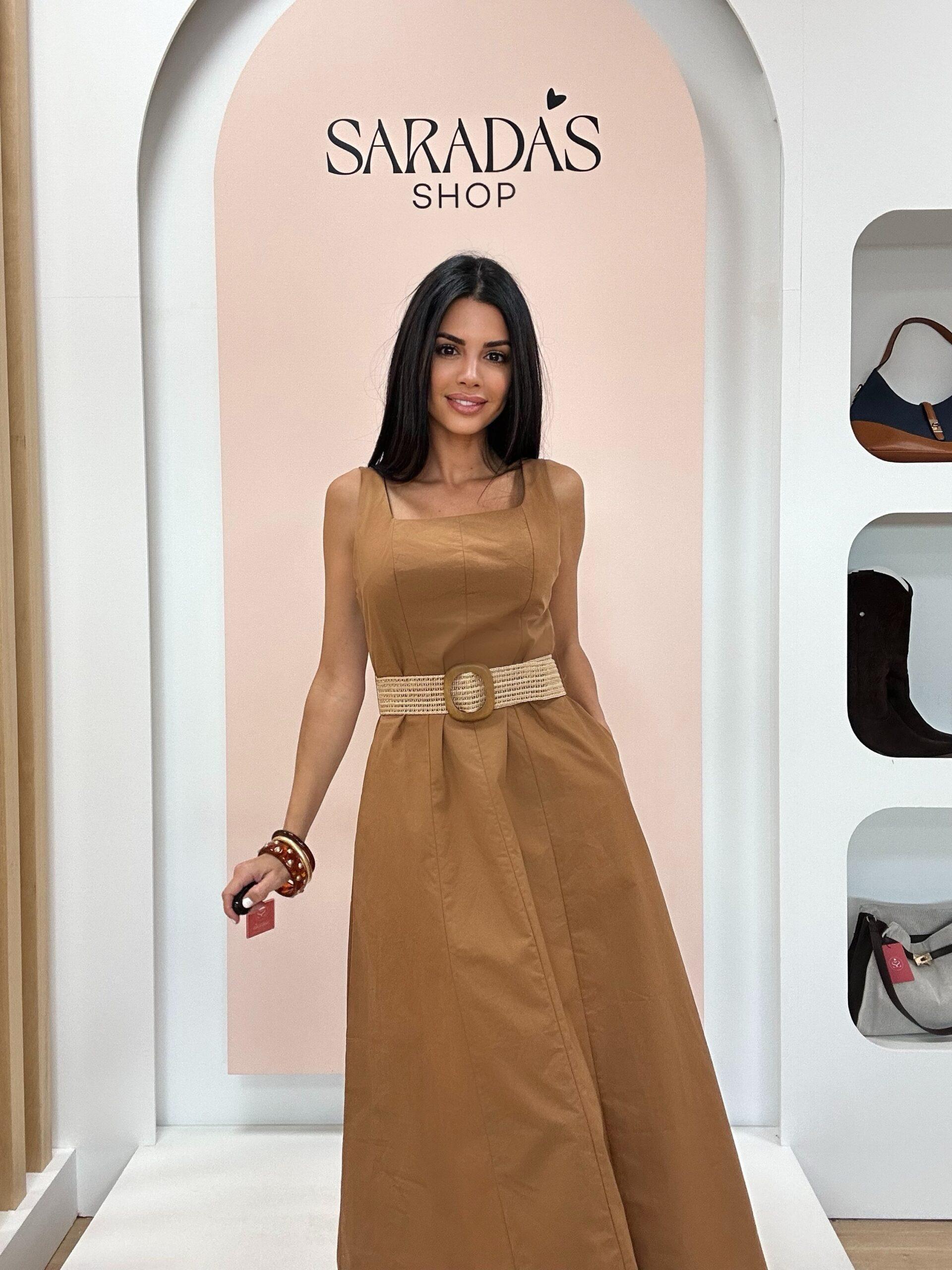 Vestido en rayón, largo de color marrón, detalle de estampado de lunares en beige, escote en V, tanto delante como detrás, tirante ancho, cierre con cremallera invisible lateral, corte sirena.