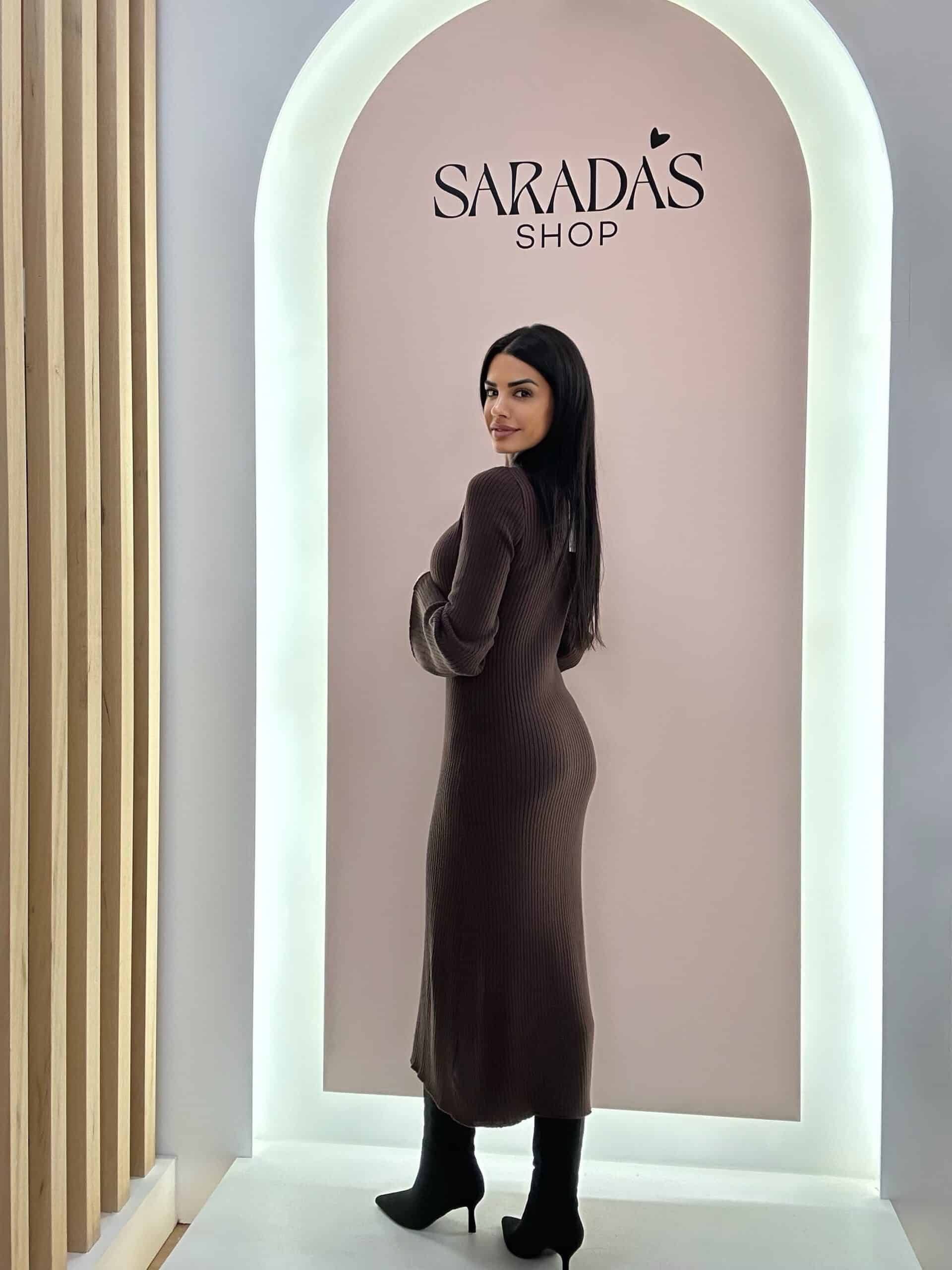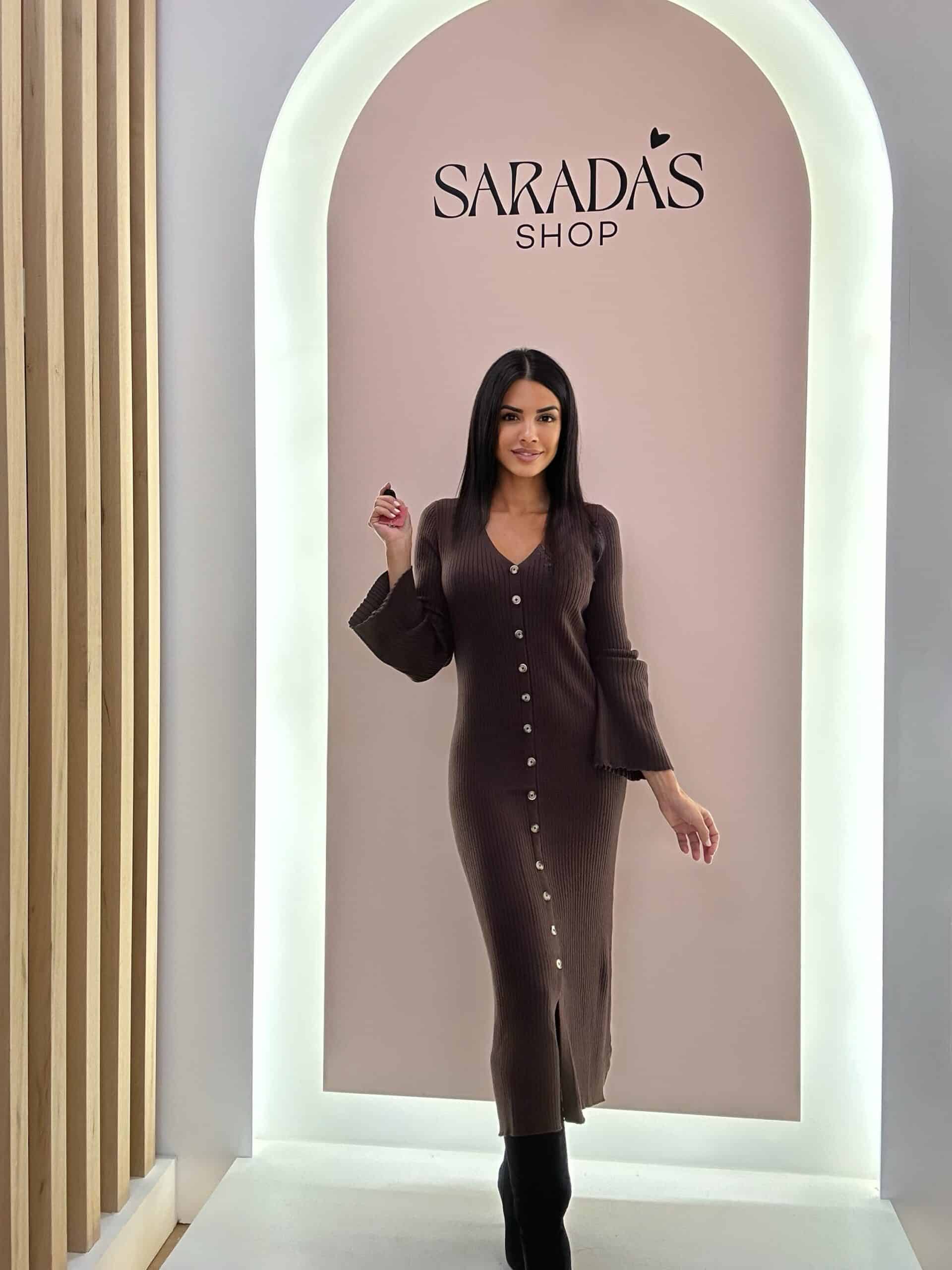 Vestido largo en punto de canalé de color chocolate, manga larga ligeramente acampanada, cuello en pico, con falsa botonadura frontal con abertura final. Talla única S/M/L Medidas que te pueden interesar: Sisa: 41,5cm. sin estirar. Largo desde la sisa: 101,5cm. 50%Viscosa. 30%Poliéster. 20%Poliamida.