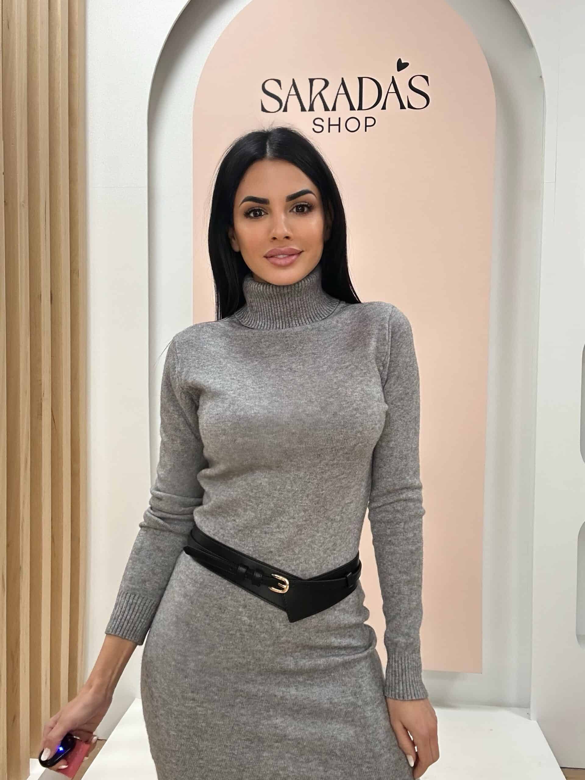 Vestido en punto elástico, de color gris, cuello vuelto, detalle de canalé en cuello, puños y bajo.