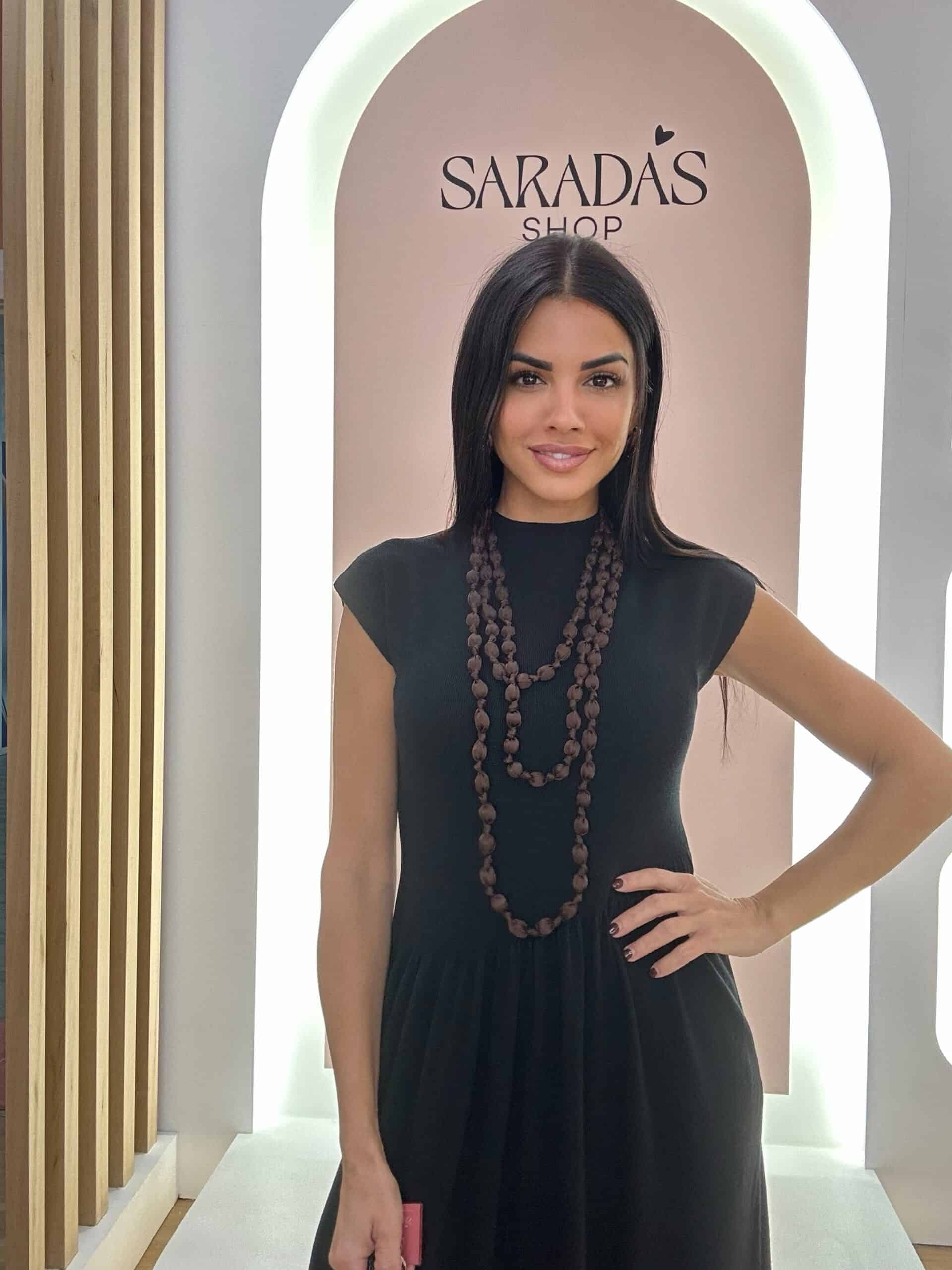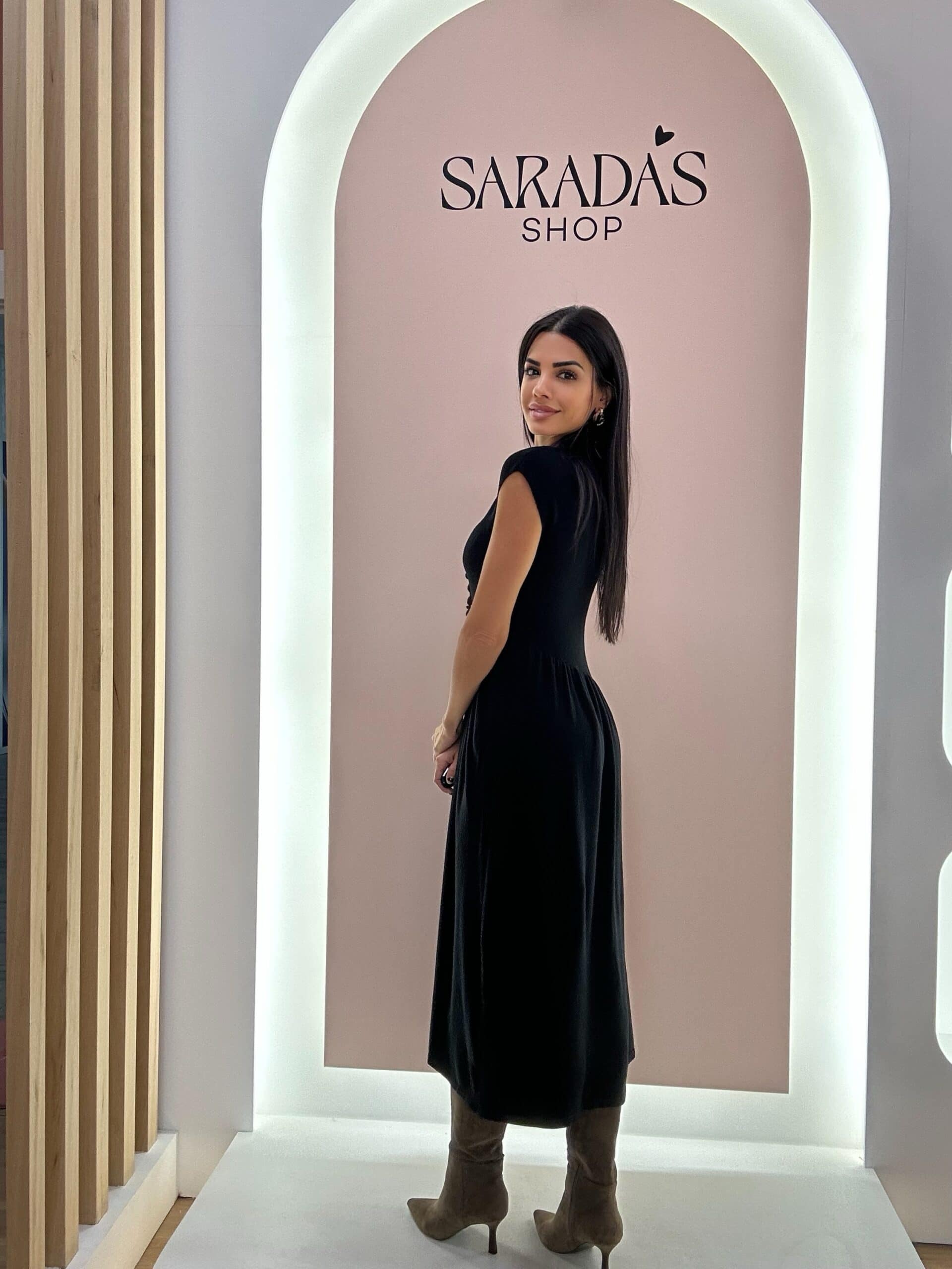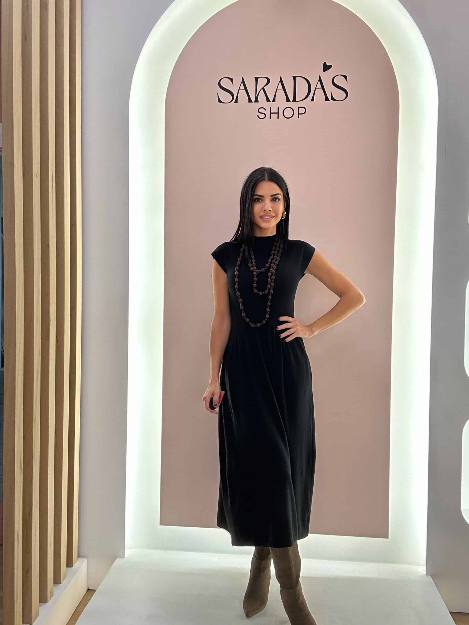 Vestido largo de punto, en color negro, sin mangas, pequeño cuello alto redondo, corte asimétrico en cintura.