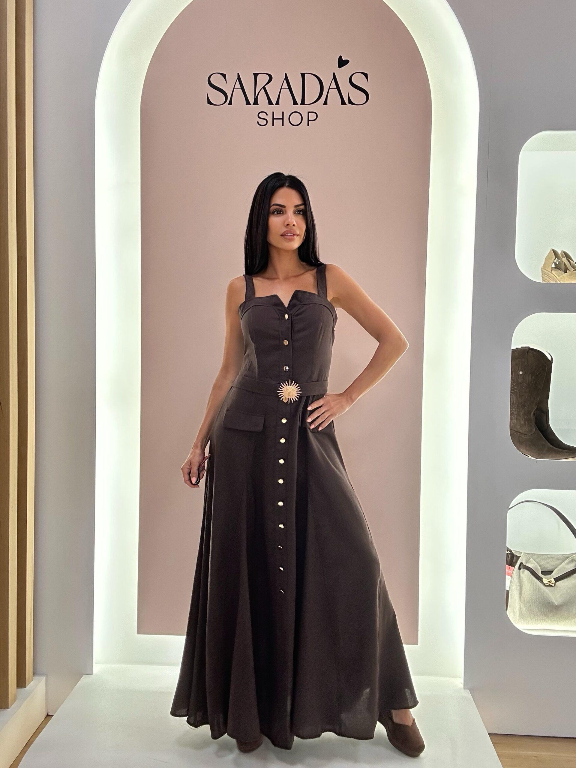 Vestido en mezcal de lino, largo de color marrón chocolate, escote en V con botonadura de botones dorados, tirante ancho, espalda con elástico en panal de abeja, detalle de cinturón integrado con hebilla de sol dorado, falsos bolsillos con solapa, y corte evasé.